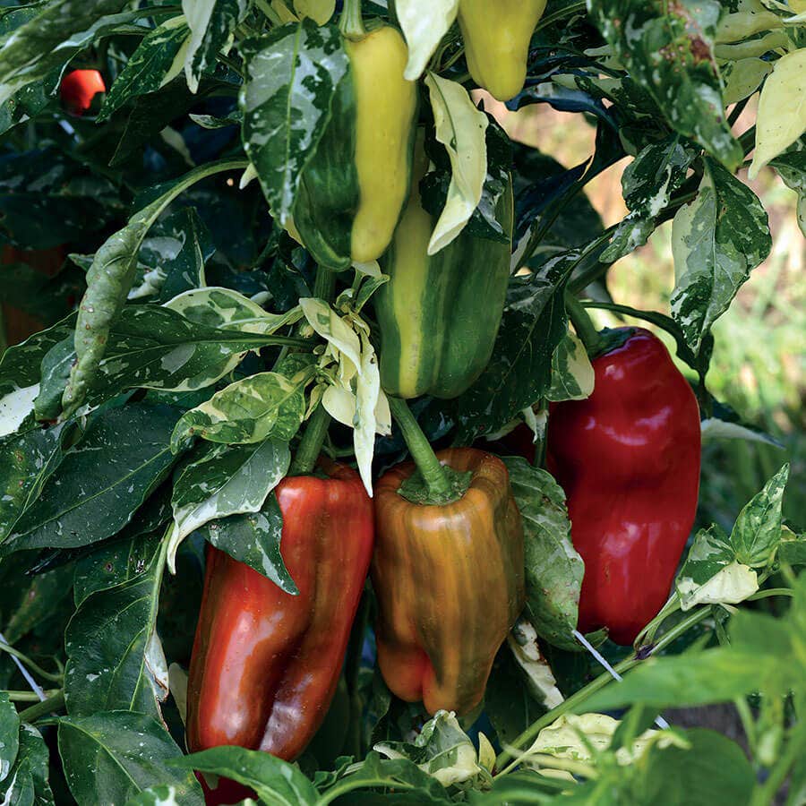 These Candy Cane Red Peppers (snack pepper) have unique, variegated foliage and fruit that ripens from green striped to solid red. Sweet flavor, thin walls, crispy texture. Perfect for eating fresh at any stage of ripeness. Candy Cane Red Peppers work well in containers or in-ground both with or without support.