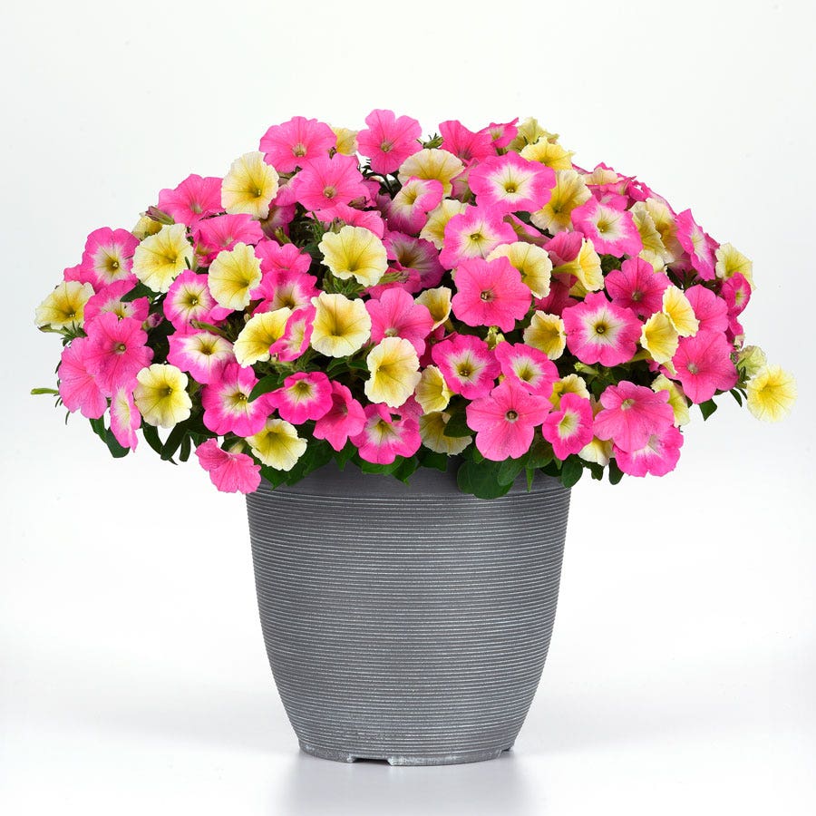The improved petunia varieties in the E3 Easy Wave® Sweet Taffy Mix are tender perennials (Zones 10-11), often grown as annuals, offering spring through summer interest. Earlier blooming than typical Easy Wave® petunias, these E3 "Extra Easy Wave" practically perfect petunias set masses of showy, fragrant blossoms non-stop over a longer season. The plants create a stunning display as the pink and yellow blooms gracefully cascade from containers, window boxes, and hanging baskets. And the flowers attract butterflies and hummingbirds to the garden.