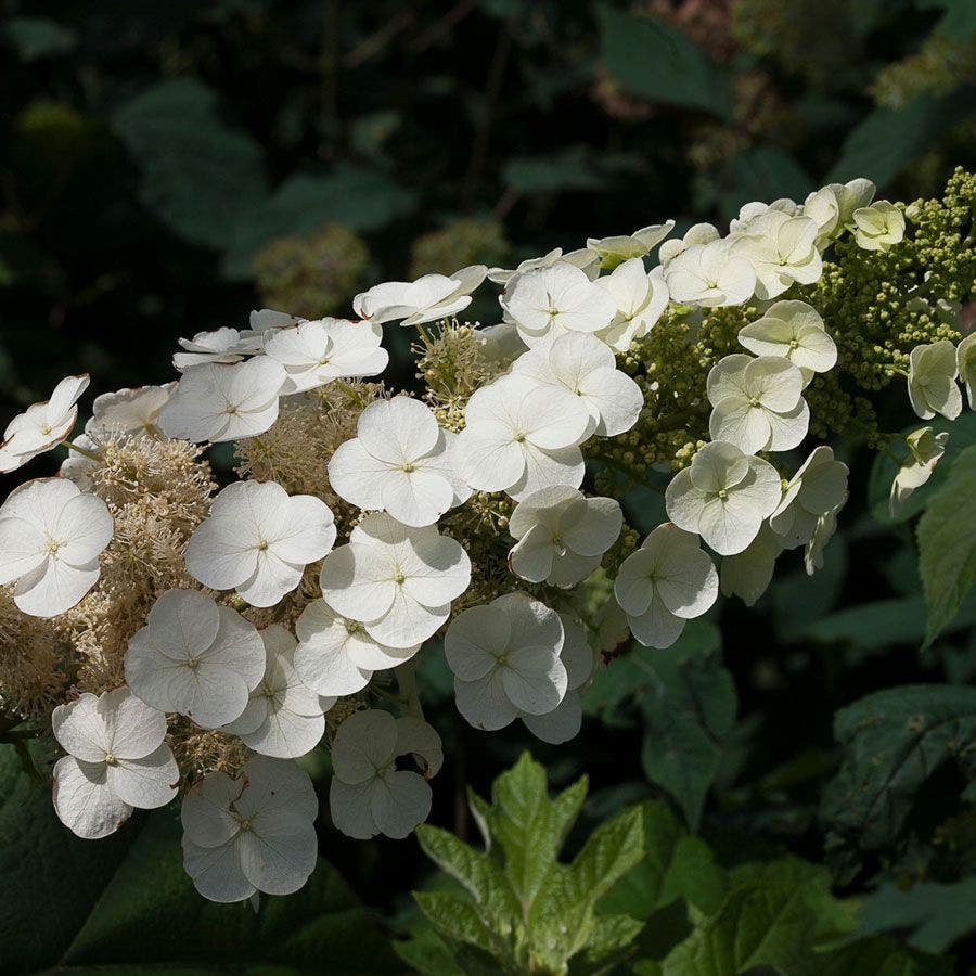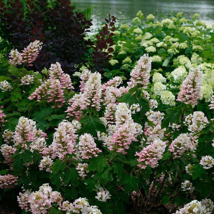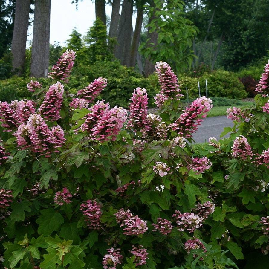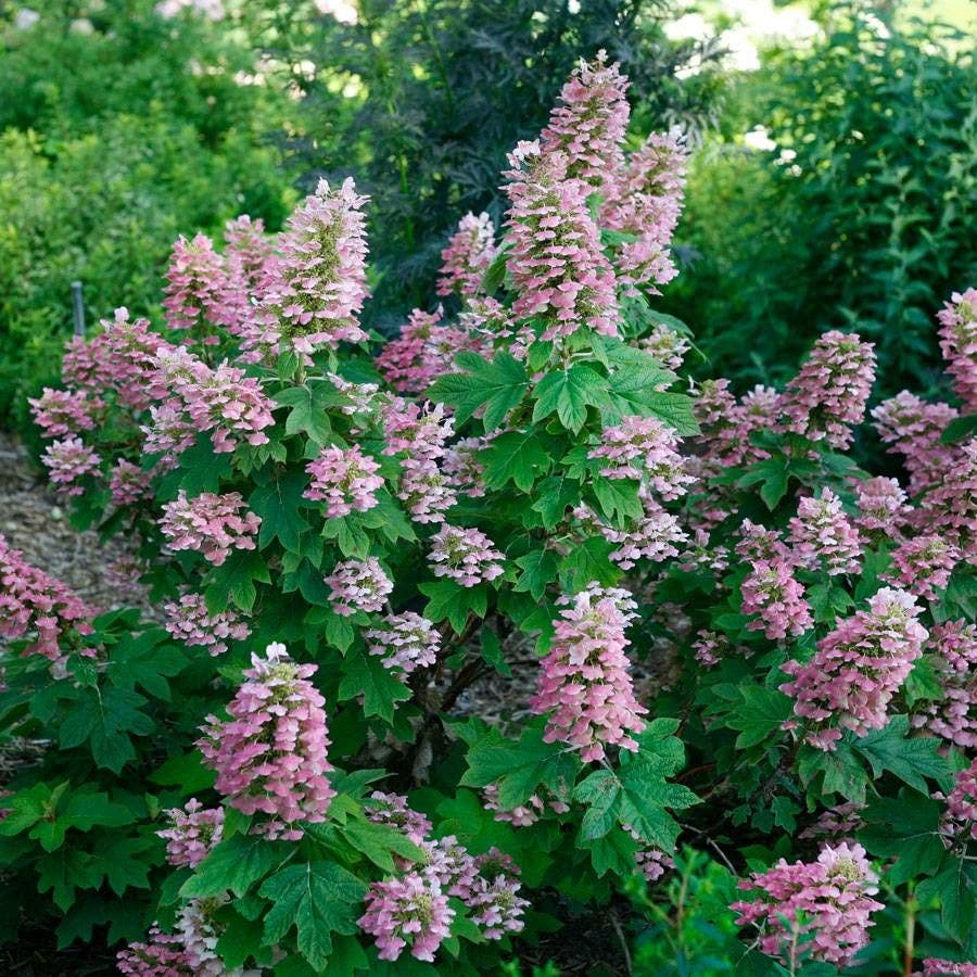 You will love this exciting new Gatsby Pink® Oakleaf Hydrangea. A selection of the native American species, Gatsby Pink® Oakleaf Hydrangea makes itself right at home in our sunny to partly shaded borders, foundation, and woodlands. Huge bloomstalks appear in summer and remain into fall, opening white and then turning pink. And the oakleaf-shaped foliage that gives this shrub its name begins green, but turns red and burgundy for autumn. Talk about multiseason interest.
