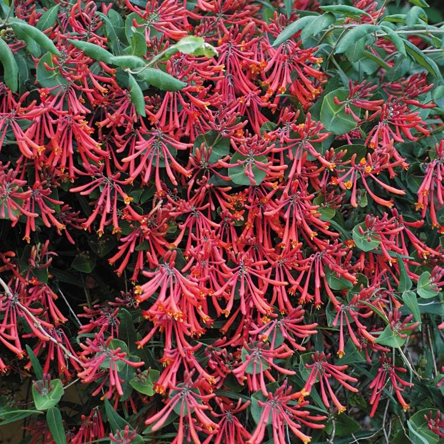 Simply the best red-flowered honeysuckle ever grown,'Major Wheeler' Honeysuckle delights with its entirely mildew-free foliage! What a difference these lush leaves make : they remain dense and lovely until frost, and the flowers keep coming as well, unbelievably abundant and not ready to quit until summer's end. And the habit is quite versatile, equally inclined to climb as a vine, mound up, or stretch along the garden floor. If you are partial to butterflies and hummingbirds, or if you need quick cover-up of a wall, fence, or unsightly garden presence,'Major Wheeler' Honeysuckle is waiting for you.
