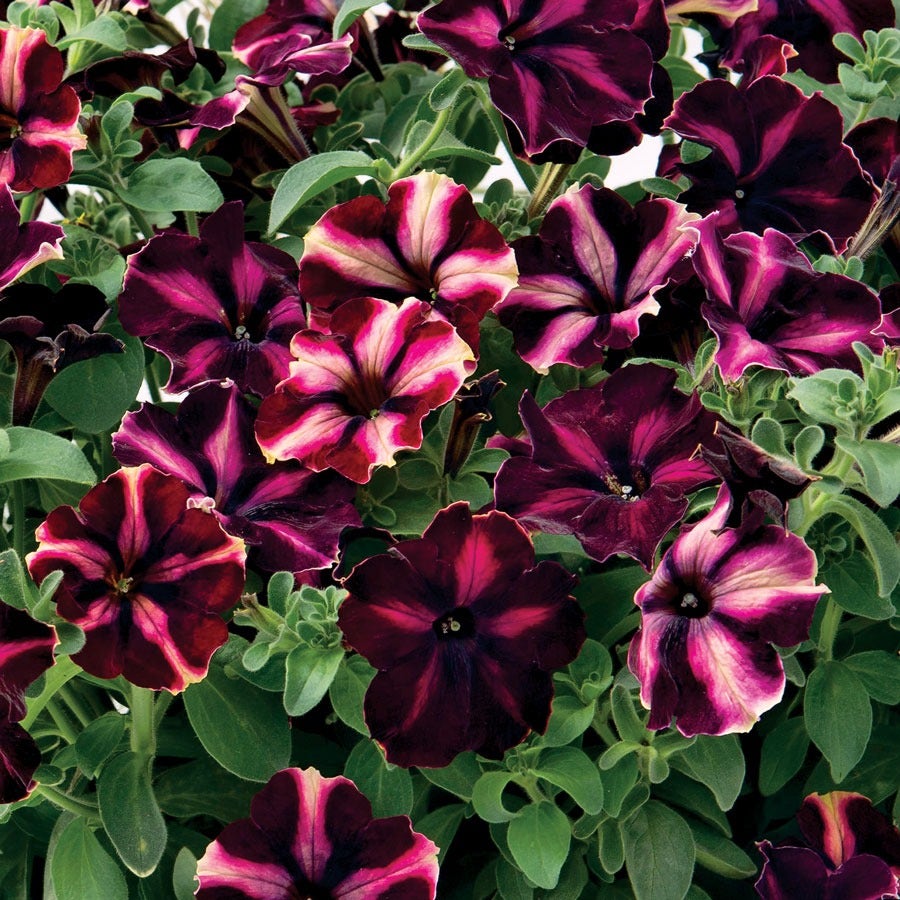 Romantica Moonlight, a multiflora, star-patterned petunia, sets small 2-inch frilled and velvety blooms in a rich burgundy hue accentuated by a light rose-colored star, with variation on the same plant and subtle changes occurring as the flower ages and the temperature fluctuates.