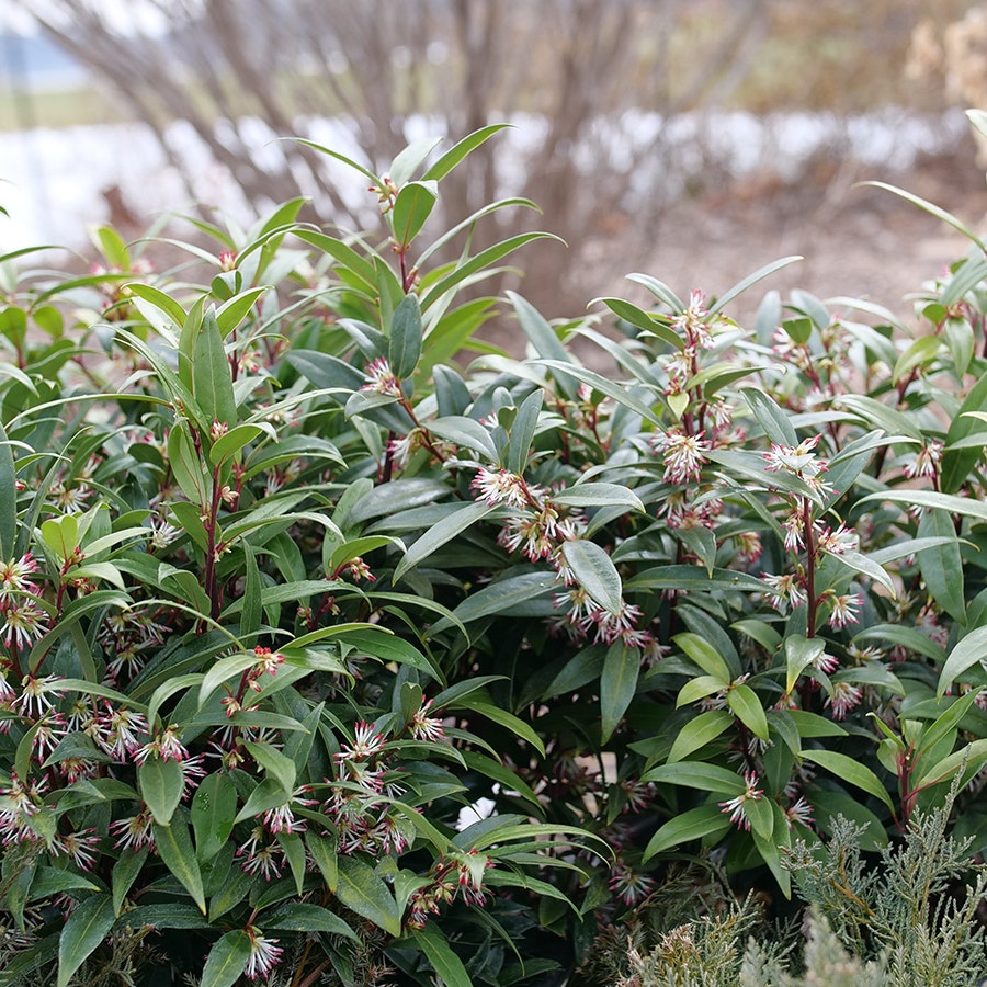 A Proven Winners® ColorChoice® Flowering Shrubs variety, Sarcococca Sweet & Lo™ sweet box is a low-growing, broadleaf evergreen shrub offering year-round interest, blooming late winter to early spring. Borne on deep purple stems, the unusual thread-like and red-tipped white flowers have a delightful fragrance, similar to jasmine, and are an important food source for early pollinators.