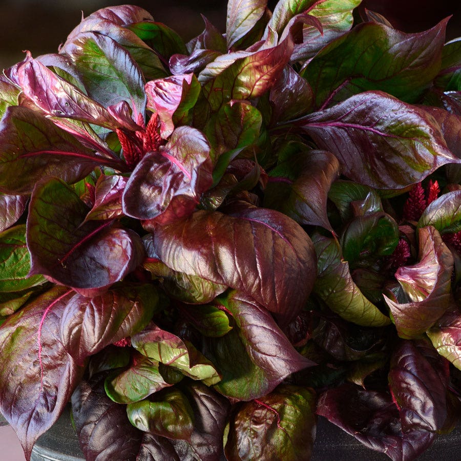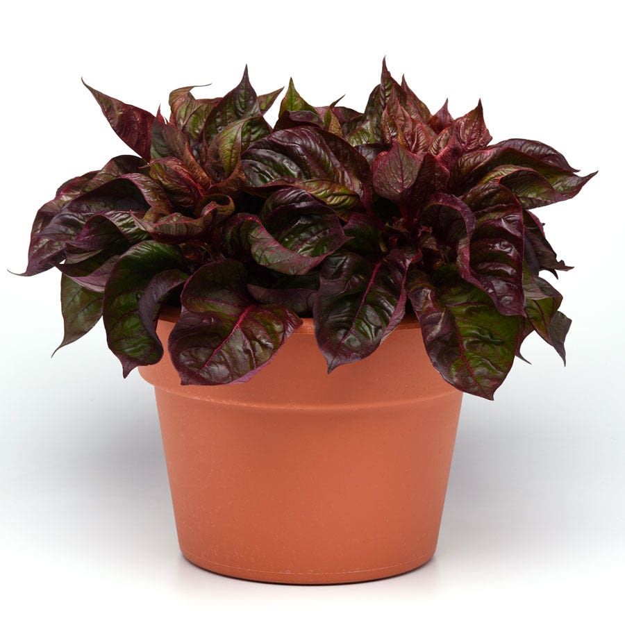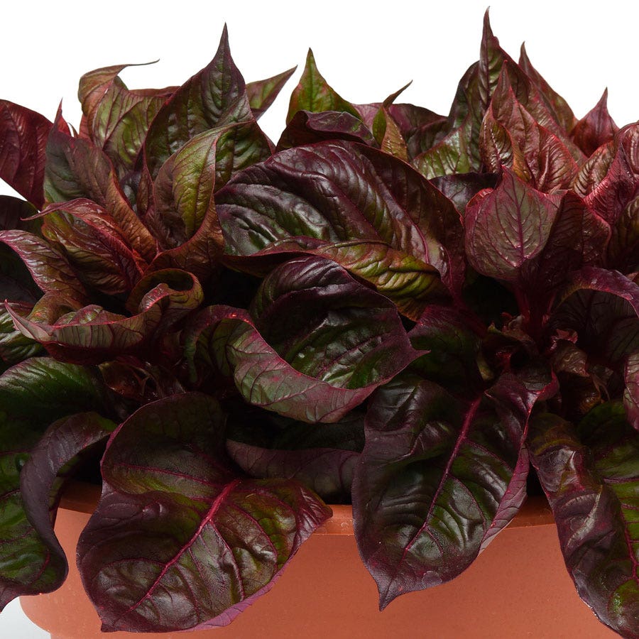 An exciting new addition to the Fantastic Foliage™ Collection, Celosia Sol™ Lizard Leaf is an annual plant grown primarily for its eye-catching foliage, offering spring through fall interest. Sol Lizard Leaf has outstanding garden performance and adds exciting color and textural dimension to garden beds and container combos. Although Sol Lizard Leaf blooms in small feathery plumes of tiny, densely packed flowers from late spring to late summer, its unique, bicolored foliage takes the spotlight with beautifully contrasting burgundy and green colors on spear-shaped leaves. The textured leaves turn vibrant burgundy red when grown outdoors but exhibit more green color when grown indoors.
