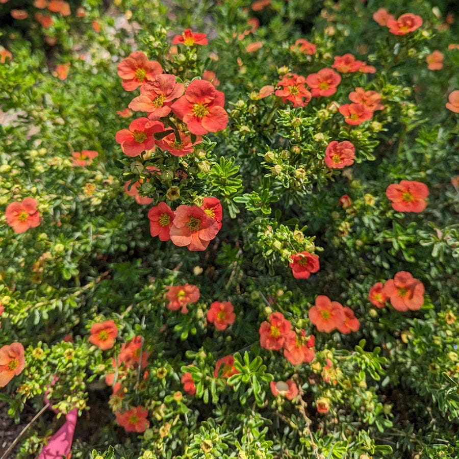A Dasiphora fruticosa (previously Potenilla fruitcosa), commonly called potentilla, shrubby potentilla, or shrubby cinquefoil, Happy Face Orange has a compact, mounding habit and is often grown as a ground cover. It's an excellent specimen or container plant but is shown to best effect massed or grouped in mixed beds, borders, and foundation plantings.