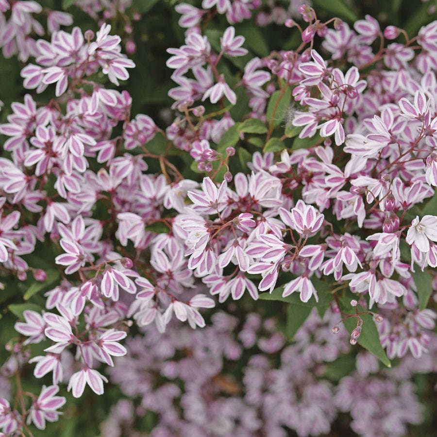 A Proven Winners® ColorChoice® Flowering Shrubs variety, Deutzia Yuki Kabuki™ is a deciduous shrub offering 3 seasons of interest. Heavy blooming, this charming bush blankets its slender branches in showy sprays of pretty pink and white blossoms from early to late spring. Nectar and pollen rich, the flowers sustain pollinators, including bees, butterflies, and hummingbirds. Its finely textured foliage remains glossy and bright green all summer but displays lovely shades of yellow, red, and purple for autumn.