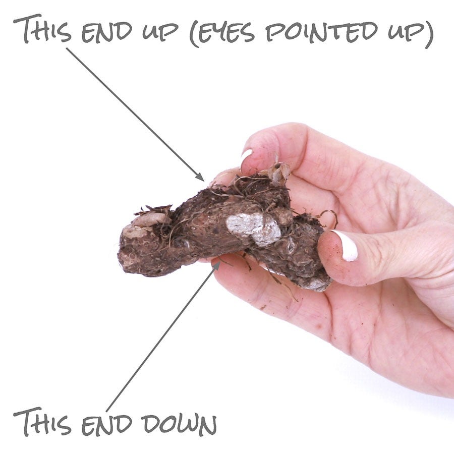 Plant bulbs in spring after the frost danger has passed, spacing them 6 to 8 inches apart and planting them 1½ to 2 inches deep with the rounded side and "eyes" facing up. For an earlier start, grow tubers indoors in flats or pots with moist peat moss or vermiculite, and transplant them outdoors when temperatures rise. Removing the main "eye" before planting results in a fuller, rounded growth habit.