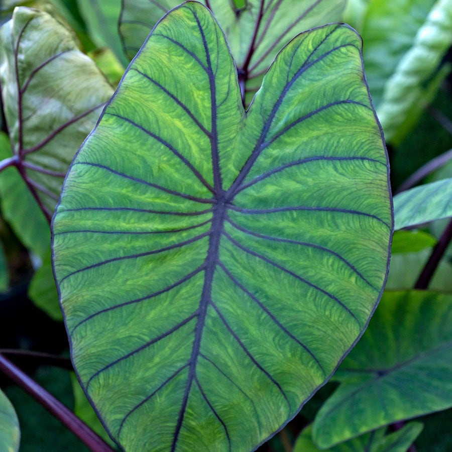 Colocasia Royal Hawaiian® Blue Hawaii Elephant Ear is a tropical showpiece that transforms any garden or container into a lush retreat. Growing 36 inches tall, and up to 50 inches under optimal conditions, its heart-shaped matte green leaves feature striking bluish-purple veins and wavy edges. The semi-glossy, burgundy-colored stems enhance its bold, exotic look. Occasionally, it may produce yellowish-green flowers (spathes), but its striking foliage takes center stage.