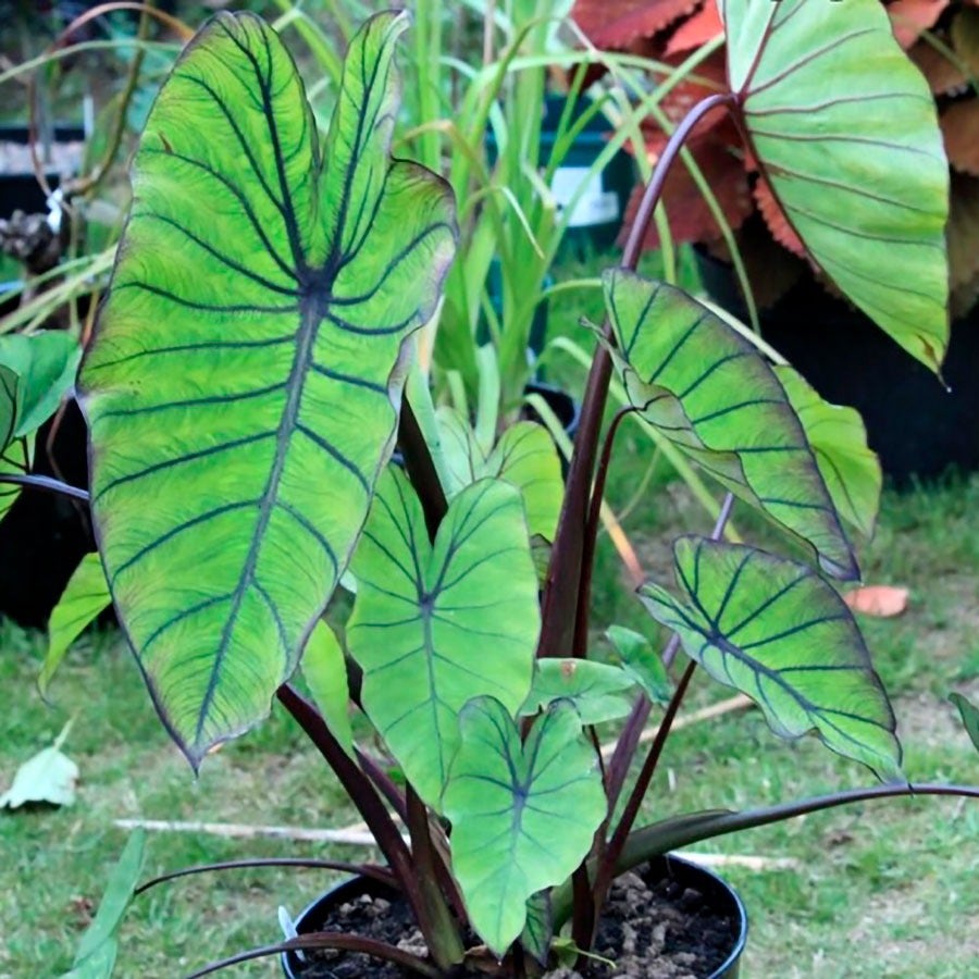 This frost-tender Colocasia esculenta variety thrives in Zones 8-12 with a compact, upright growth habit. Ideal for container gardens, it's also stunning indoors in a bright location or as a striking addition to pond margins and rain gardens. Plant it solo for a bold statement or pair it with colorful flowers to create a layered tropical effect.