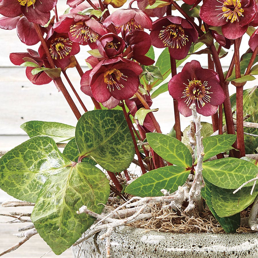 Vibey Velvet™, part of the Frostkiss® series, is a resilient evergreen perennial that provides year-round color and texture to the garden. Growing to 12 to 18 inches in height and width, this hellebore bursts into a spectacular winter bloom with smaller but plentiful flowers compared to others in the series. Each rich, dark red flower, tinged with burgundy flecks, is held singly on long, sturdy deep-red stems above a dense base of leathery, variegated foliage. These nectar-rich blooms support early pollinators and are perfect for winter floral arrangements, lasting beautifully in the garden or as cut flowers.