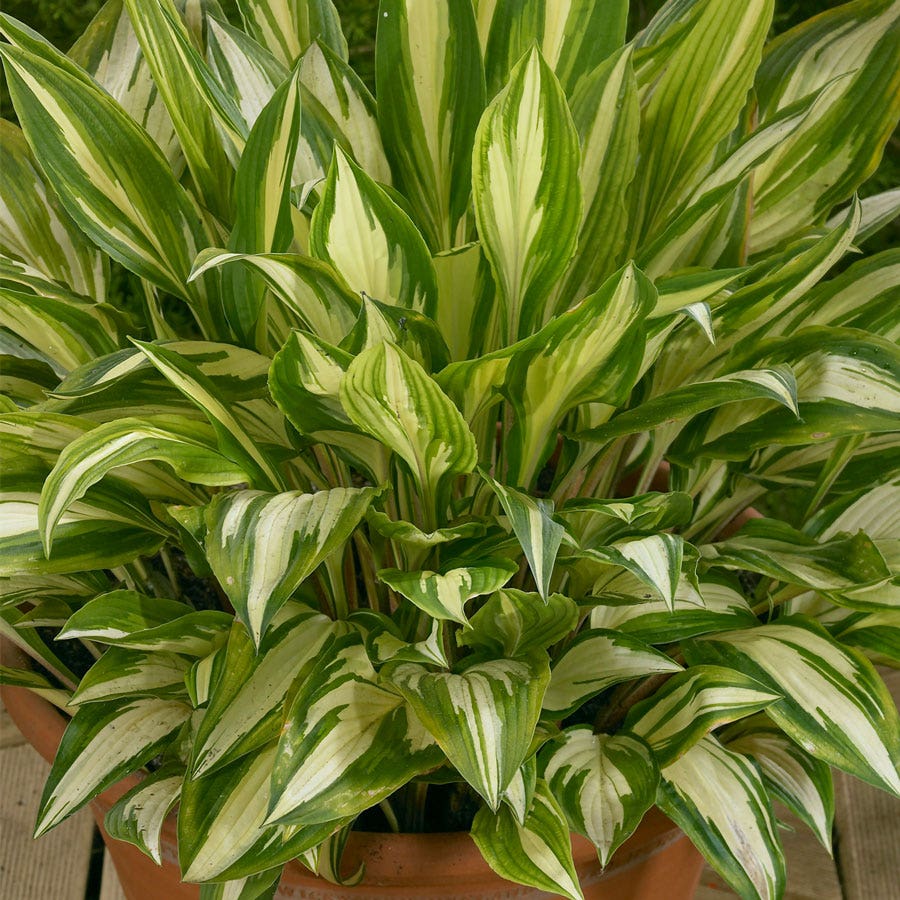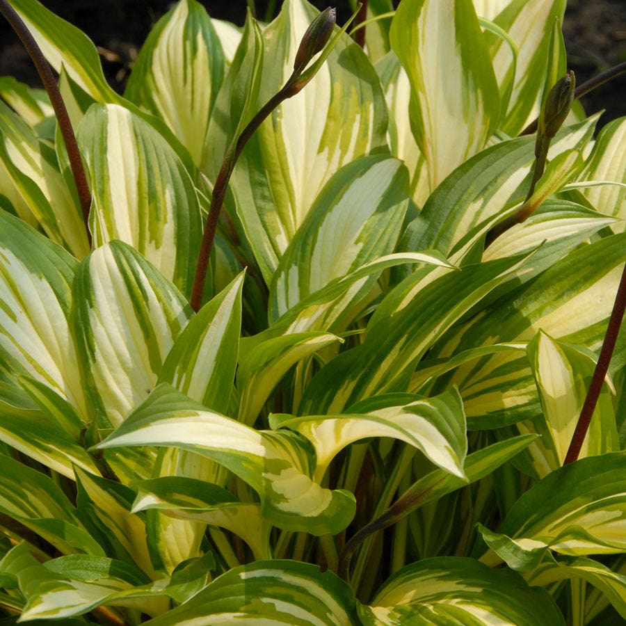 Small yet striking, Hosta 'Cherry Berry' grows to just 12 to 18 inches tall and wide, making it a perfect choice for small gardens or containers. Its lance-shaped leaves boast bold variegation, with green margins encircling creamy white centers. In summer, vibrant cherry red scapes emerge, holding delicate purple blooms that draw hummingbirds and butterflies. By autumn, the scapes are adorned with bright red seed pods, providing additional seasonal charm. The flowers also make elegant additions to mixed floral arrangements.