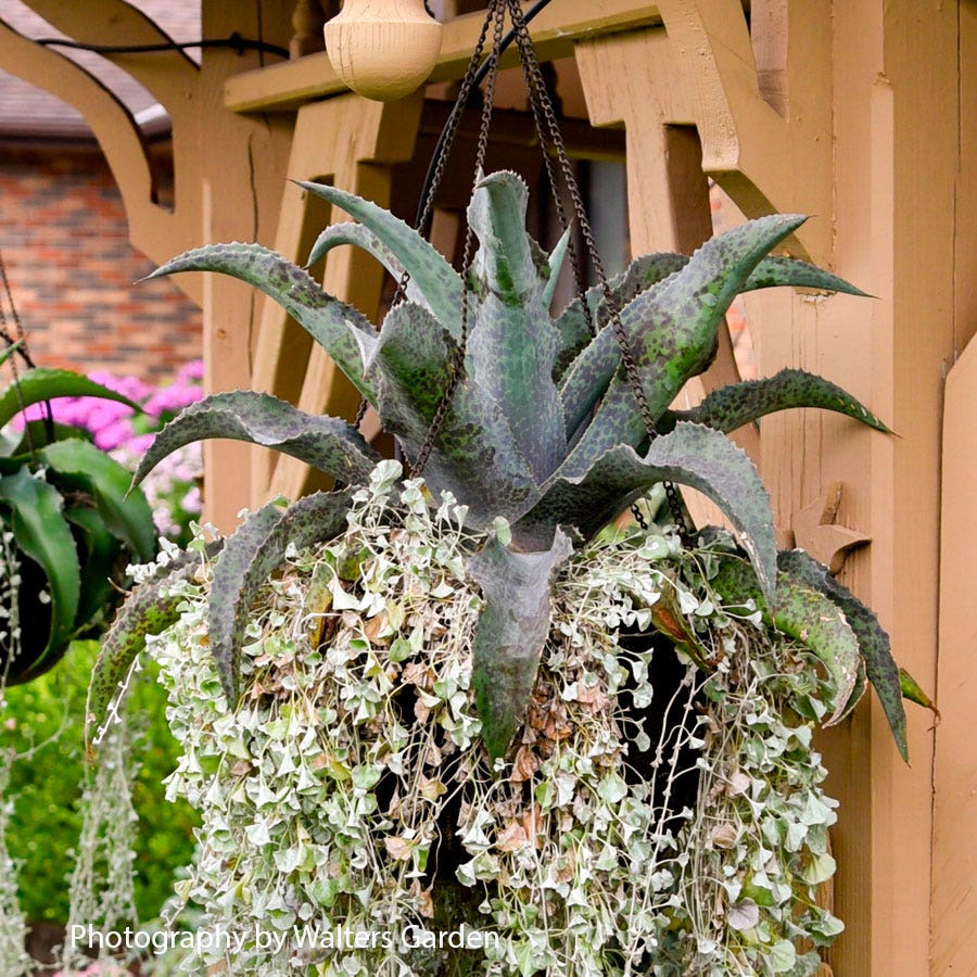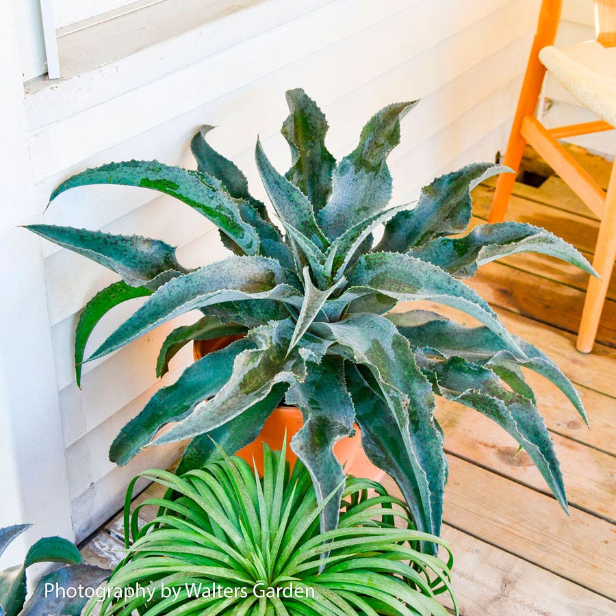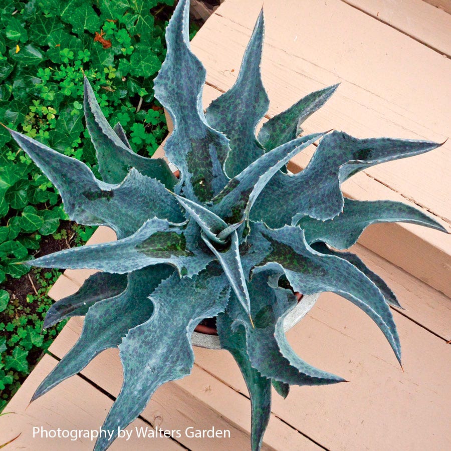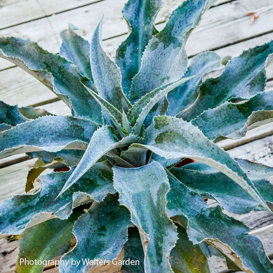 The Mangave Art & Sol® 'Catch a Wave' is part of the Proven Winners®. 'Catch a Wave' is a distinctive succulent that brings bold texture and striking color to gardens and containers. Growing to a compact 8 to 10 inches in height and spreading up to 20 inches wide, this sculptural plant forms a rosette of wavy, silvery-blue leaves. In bright sunlight, its thick foliage takes on rich dark spots, adding depth and a unique artistic feel. Edges curl slightly, displaying soft, flexible teeth that give it a whimsical, wave-like formideal for adding architectural interest to garden beds, rock gardens, or mixed containers.