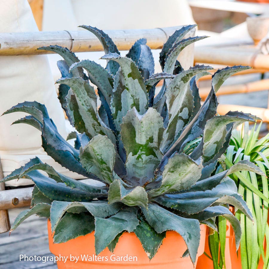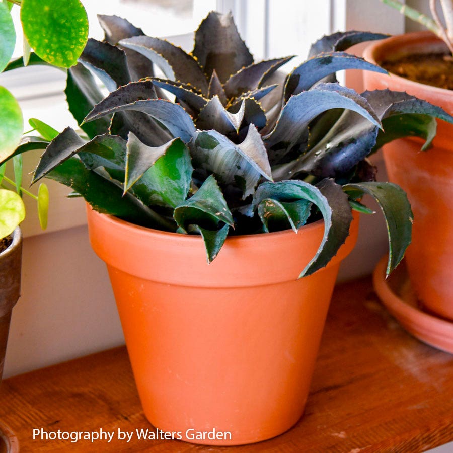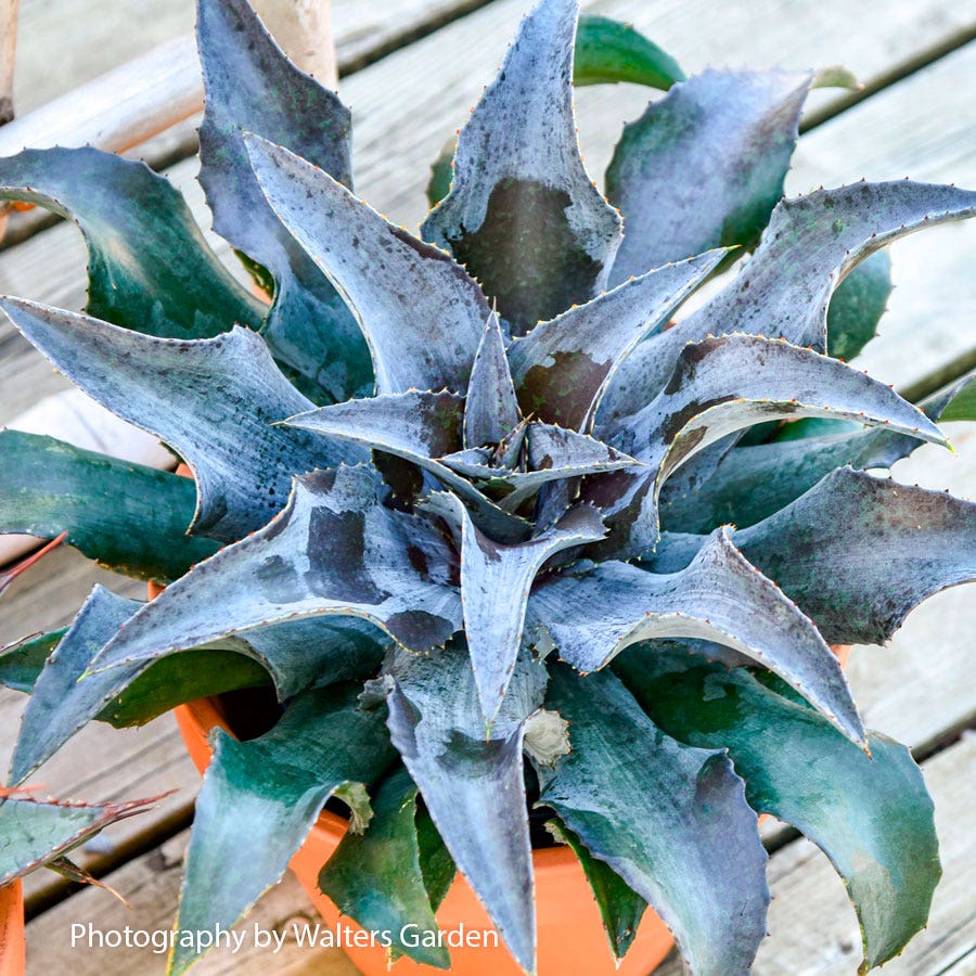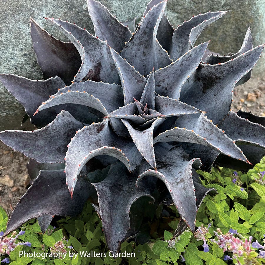 The Mangave Art & Sol® 'Night Owl' adds a bold, dark elegance to gardens and containers. This compact succulent from the Proven Winners® Art & Sol® collection grows only 6 to 8 inches tall, with a spread of 16 to 18 inches, making it perfect for small spaces that need a big visual impact. Its rosette features broad, arching leaves edged with spiny margins that create a striking architectural symmetry. With dense, dark purple spots that deepen to an almost black hue in full sun, 'Night Owl' brings a captivating, mysterious touch to landscapes, container gardens, and houseplant collections.