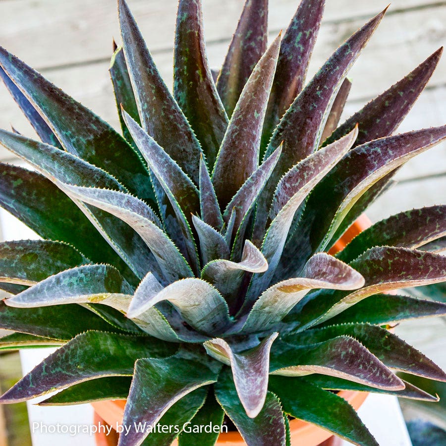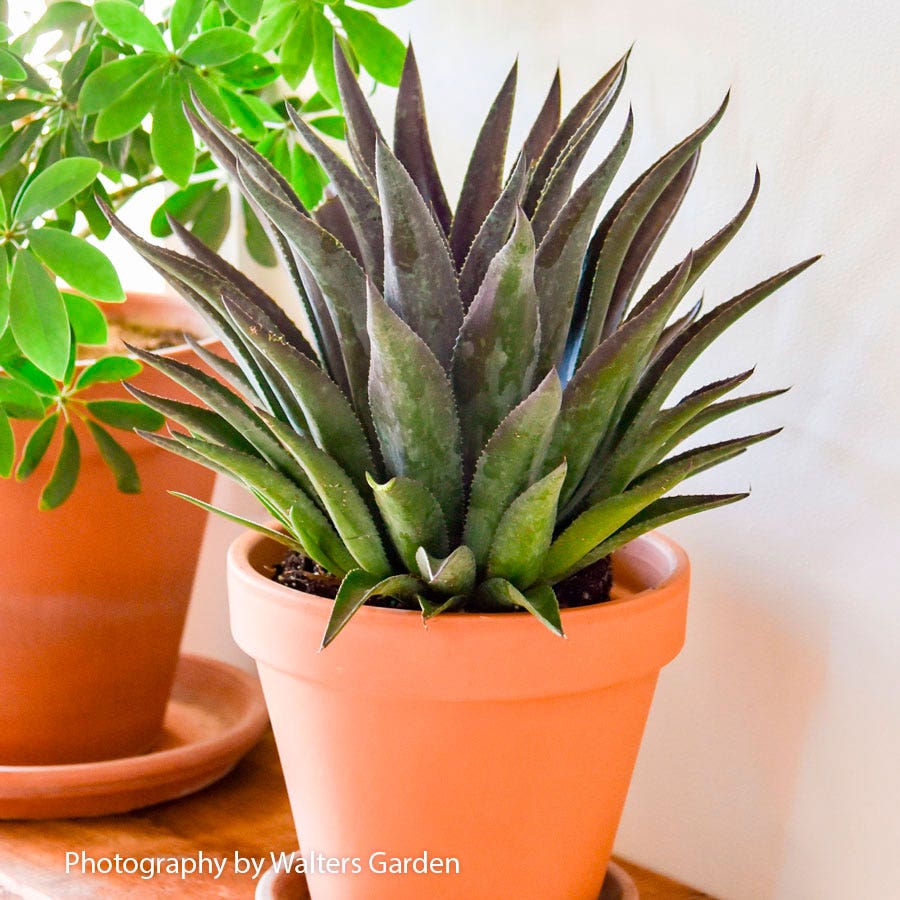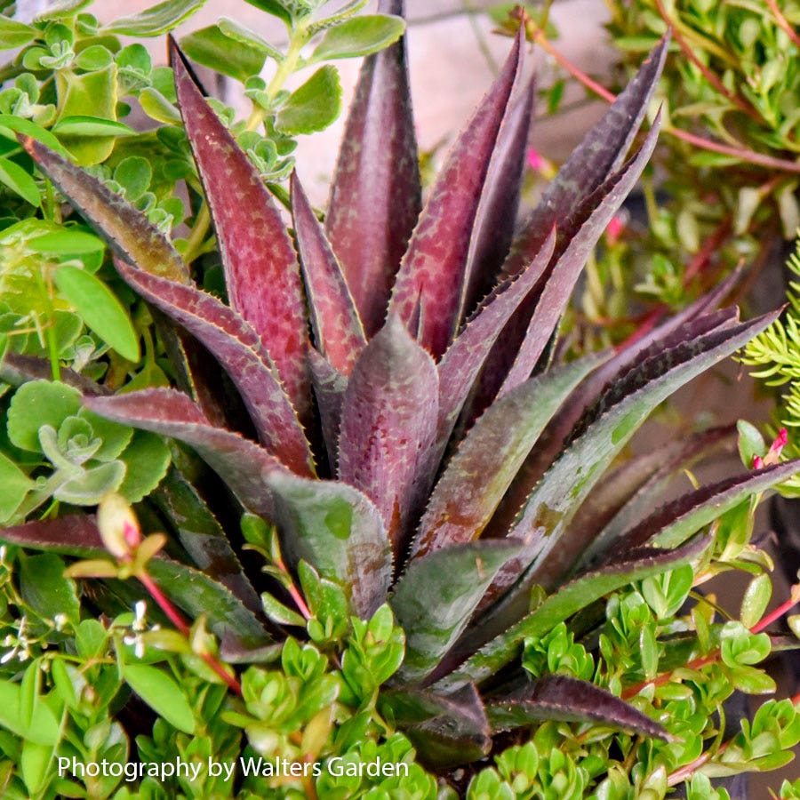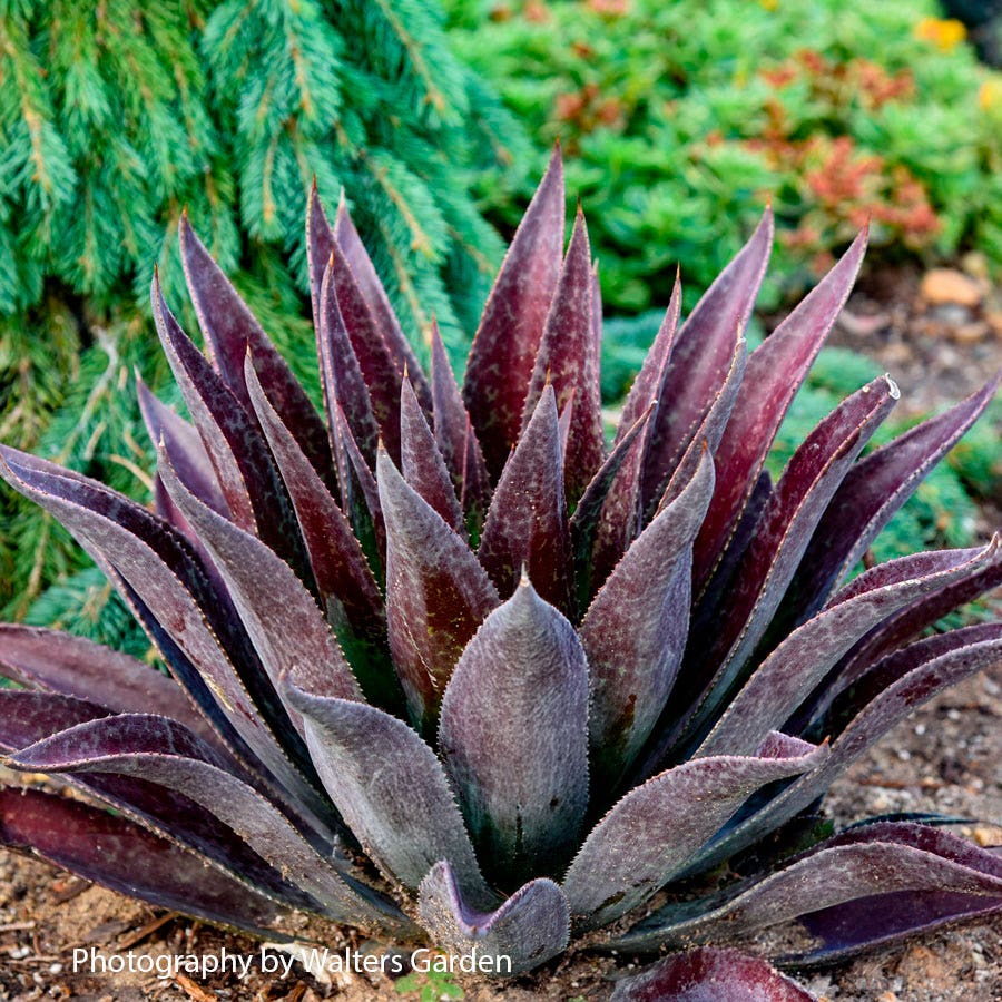 The Mangave Art & Sol® 'Thunderbird' is an eye-catching succulent that brings exotic, architectural beauty to any garden or container. Part of the Proven Winners® Art & Sol® collection, 'Thunderbird' is compact, growing 8 to 12 inches tall and spreading 10 to 12 inches wide. It forms an elegant rosette of fleshy, cup-shaped leaves with firm, toothed edges. The leaves are richly mottled with reddish tones that deepen in full sun, giving this succulent a striking, sophisticated look. Its compact shape and dramatic color make 'Thunderbird' an ideal focal point, drawing the eye in any setting.