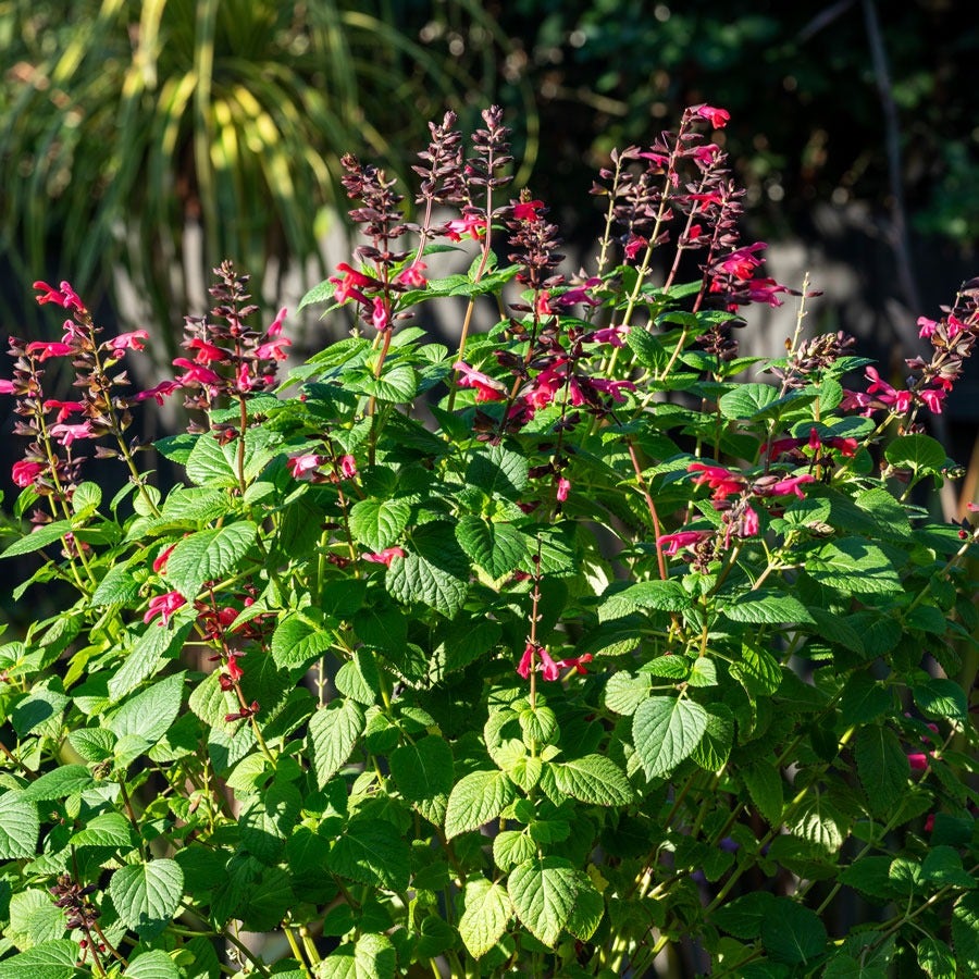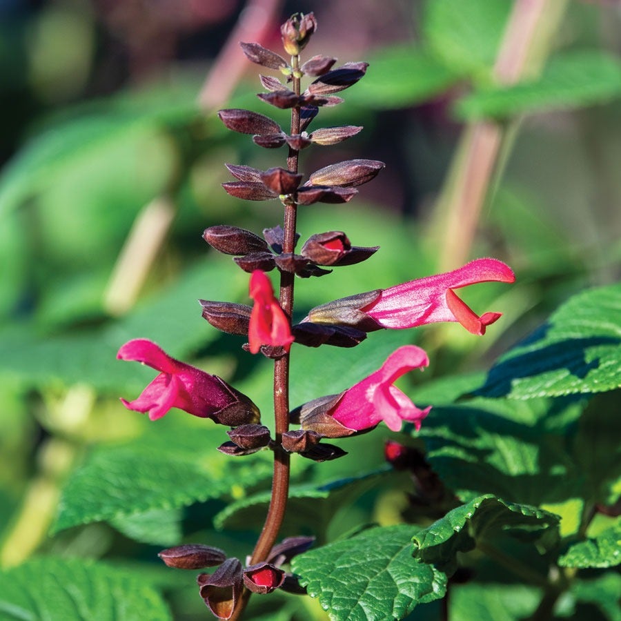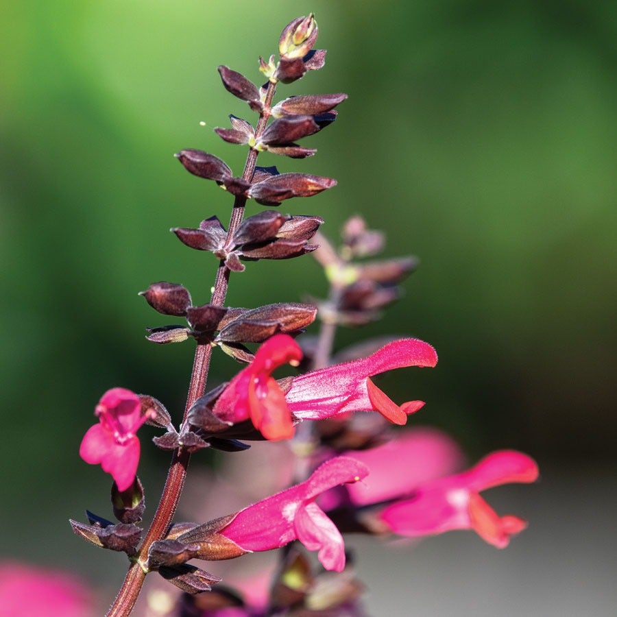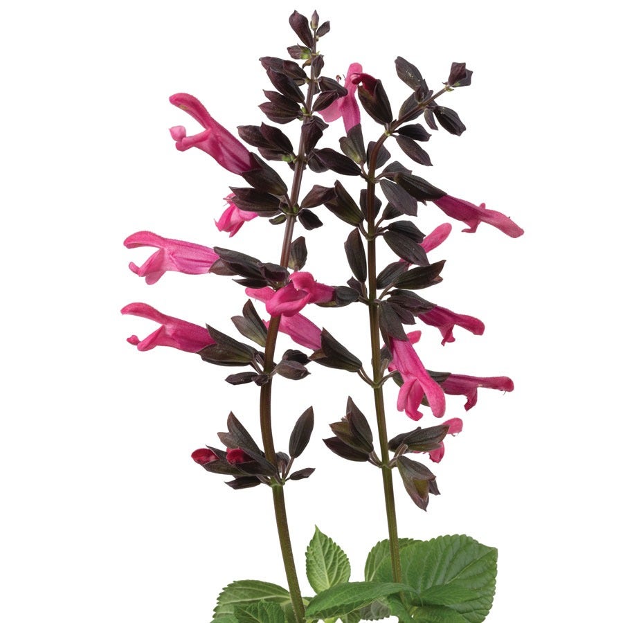 Salvia Bodacious® 'Jammin Jazz' is a striking compact perennial (Zones 8-10) that reaches up to 36 inches in height and width, blooming abundantly from mid-spring through late fall. The vibrant, tubular flowers are a bold hot pink, set off by rich chocolate-black calyxes and stems that hold the blooms just above the foliage. The medium green leaves remain lush and vibrant, even under intense summer heat. Perfect for attracting pollinators, 'Jammin Jazz' is a favorite among bees, butterflies, and hummingbirds.