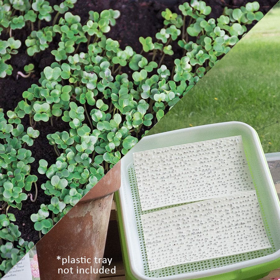 - Saturate the grow mats for microgreens with warm water to enhance germination and set the saturated mats on the netted tray insert located in the Sow Effortless Microgreens Kit.