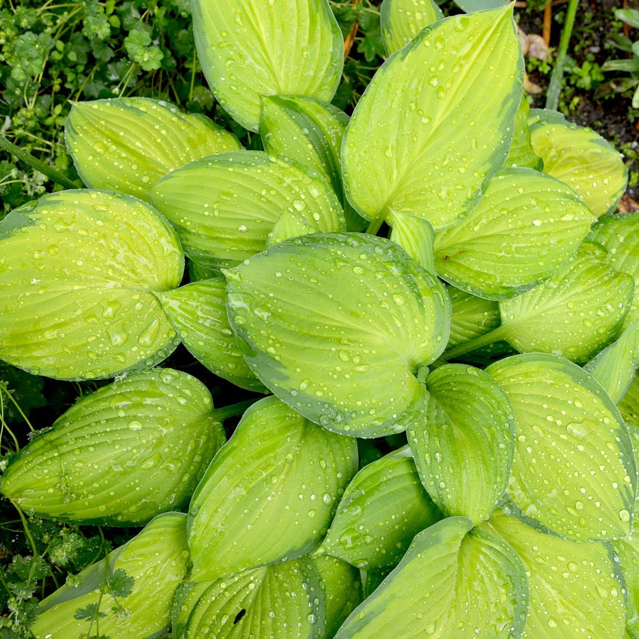 'Stained Glass' Plantain Lily, a fragrant variety, is an herbaceous rhizomatous perennial that captivates with three seasons of interest. Prized for its dramatic ornamental foliage, 'Stained Glass' boasts huge, broad, heart-shaped leaves featuring a bright golden-yellow center and dark green margins. The leaves are adorned with prominent veining, creating a stained-glass window effect that intensifies with more sun, which also brings out additional golden tones. Late summer brings large, fragrant, pale lavender (almost white) flowers on long 30-inch scapes, attracting butterflies and hummingbirds and making delightful additions to floral arrangements.
