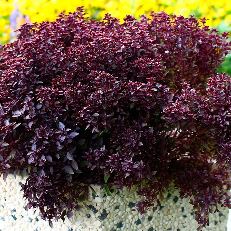 Beautiful, edible, and very aromatic, Purple Ball is a perfect basil for an edible landscape or a pretty patio pot. This unique herb is highly decorative. It grows into a rounded ball shape that's packed with tiny deep-purple leaves, and it blooms in small, tubular purple flowers. The leaves have an excellent flavor and can be dried or covered in olive oil and frozen for later use.