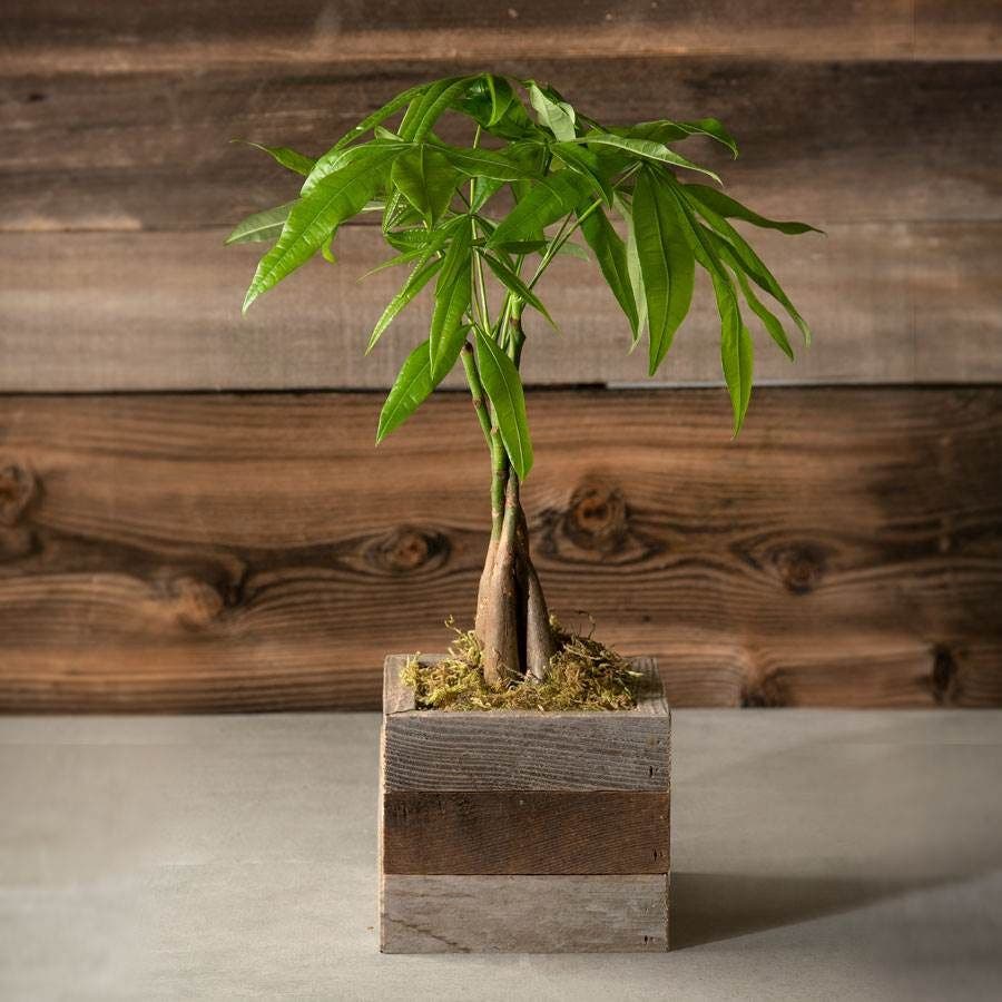 You'll enjoy this easy to care for tree with its braided stems and palm-like display, planted in a rustic reclaimed wood container. The leaves of the money tree are deeply veined and textured, perhaps one of the reasons it is among the best houseplants for purifying the air. As its name suggests, money trees are said to bring good luck and fortune, making it a perfect gift in celebration of many milestones. The money tree and its distinction for sharing goodwill make it a particularly thoughtful gift for retirement, a new job, graduation, housewarming, and anytime.