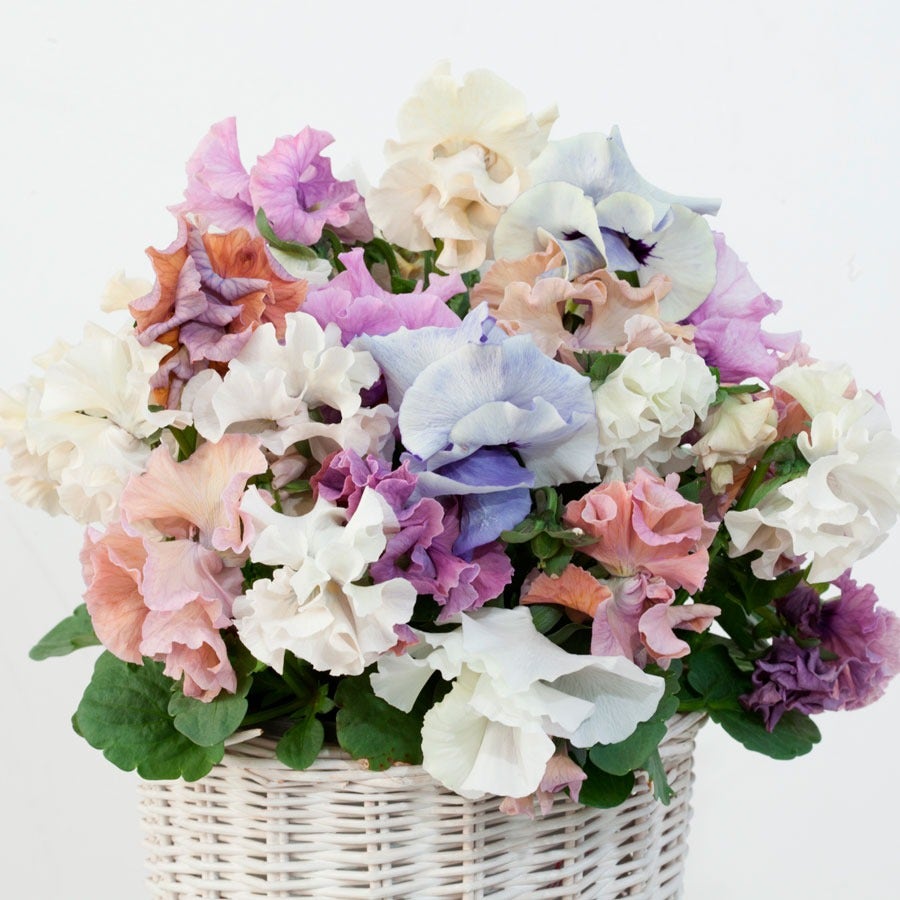 Sweet Pea Mix contains Viola wittrockiana varieties, commonly called pansies, that have a delicate look but a hardy, tough, and highly adaptable nature. They have a tidy, tightly branched, upright habit of medium to dark green leaves that's shown to best effect when mass planted or grouped in beds and borders. But pansies are perfect for containers and hanging baskets.