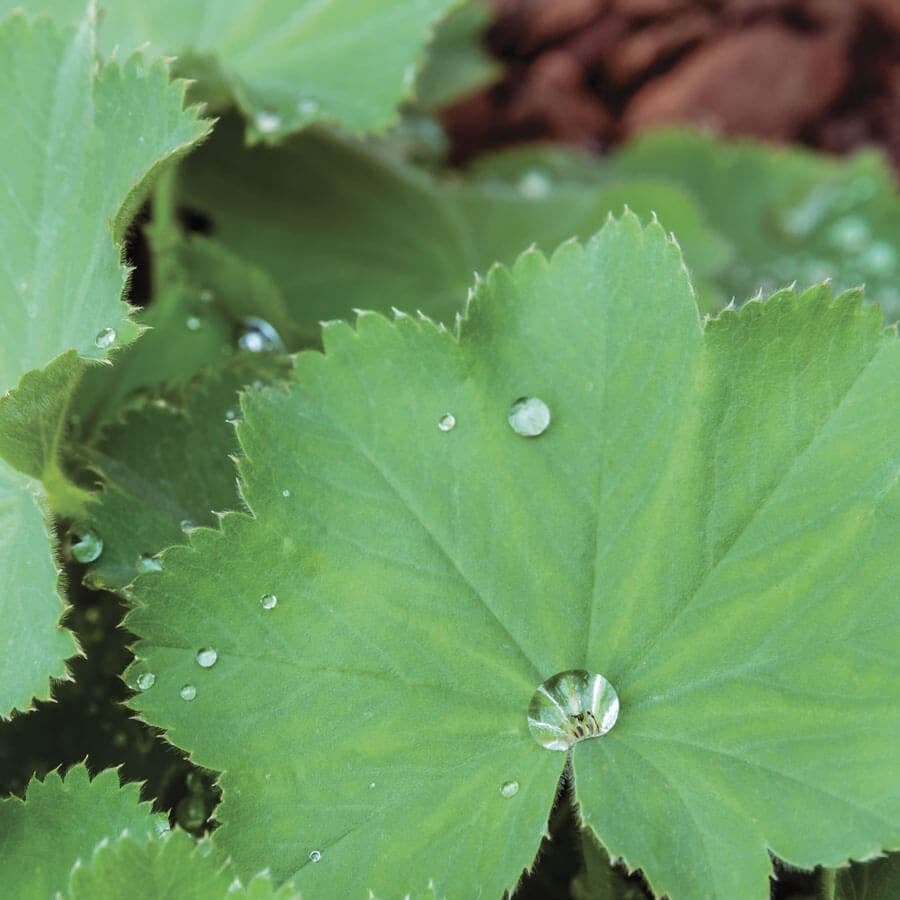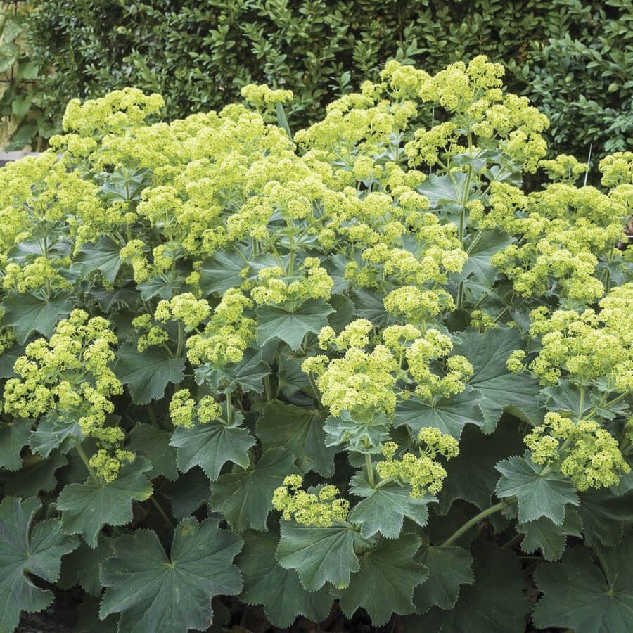 Lady's mantle blooms from late spring to late summer in massive billowy clouds of tiny lime-green flowers above a clumping mound of attractive round and scalloped gray-green leaves. The velvety leaves hold water and glisten in the sun when covered with morning dew or rain droplets. The flowers attract butterflies but produce viable seeds without pollination, allowing the plant to spread extensively. If reseeding is undesirable, deadhead before seeds ripen.