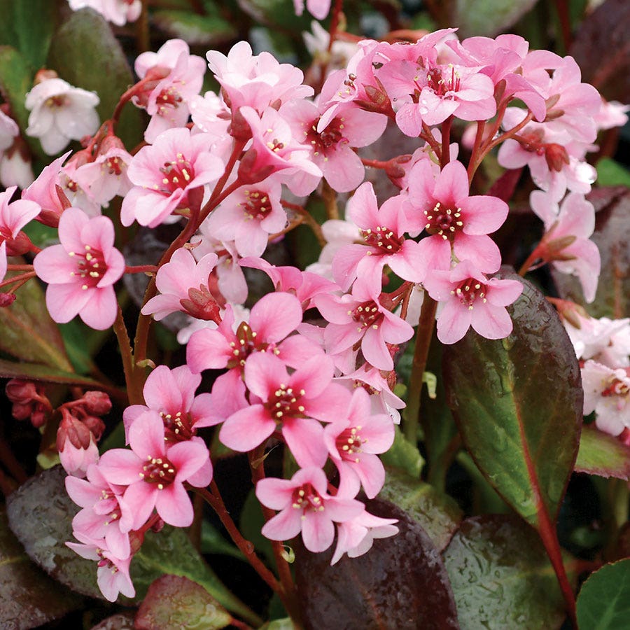 Commonly known as "Pigsqueak", Bergenia are clump forming evergreen perennials native to central Asia with large, leathery leaves with wavy or saw toothed edges. Bergenia are incredibly hardy and reliably evergreen and 'Pink Dragonfly' is no exception! It forms a low clump of long, narrow, dark green leaves which develop rich burgundy tones when the weather turns cool in the fall and winter. Taller stems of bell shaped hot pink flowers rise above the shiny foliage in the middle of spring. It looks beautiful when planted in mass or used as an edging along a walkway. Brightening up your landscape with foliage interest and pretty pink blooms. This is the plant for you if you're looking for multi-season interest! Dark green foliage, a wide range of pink blooms in the spring, not to mention the dark plum foliage in the fall and winter. Add it to your beds and borders and you'll never be bored.