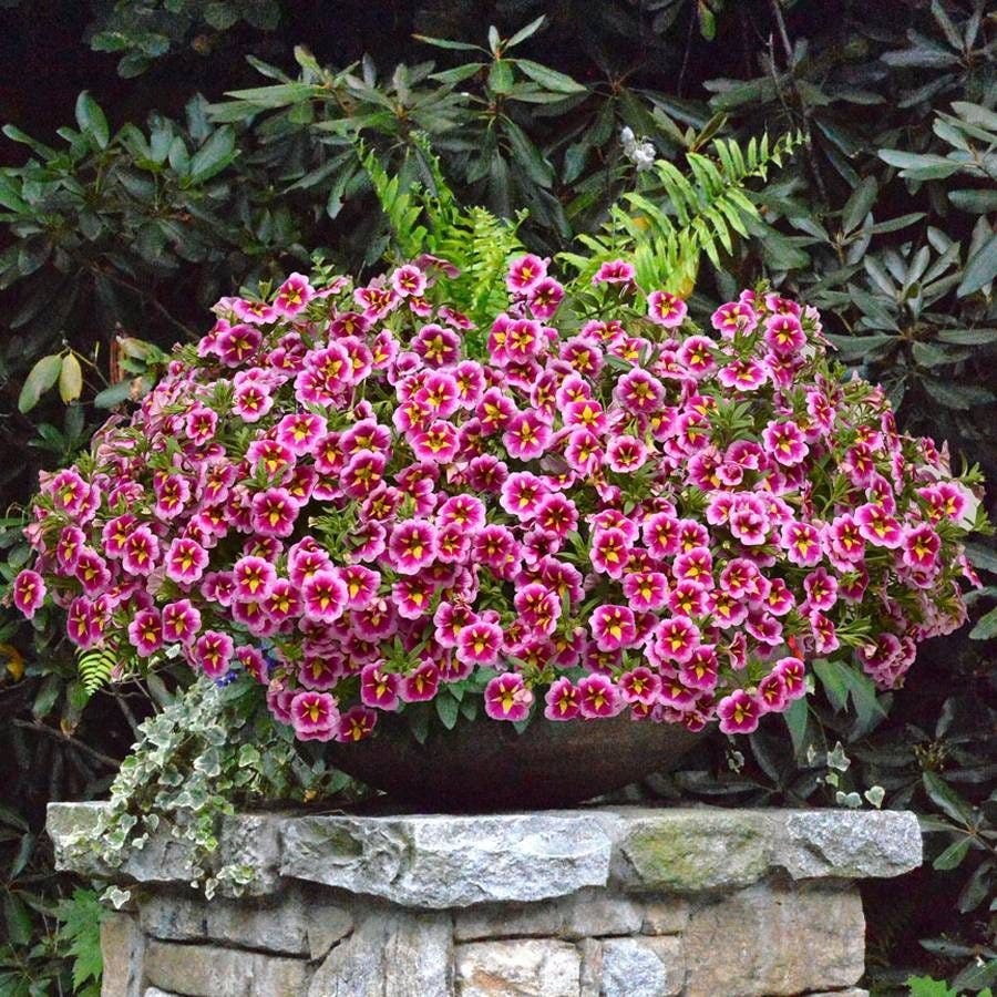 Calibrachoa is known for unstoppable flower power, delivering hundreds and thousands of brilliant blooms to hanging baskets, planters, windowboxes, and tubs from late spring into fall! Now you can get all that glory in a fascinating new bloom type -- the first-ever mIni petunia to sport a contrasting star on every flower!