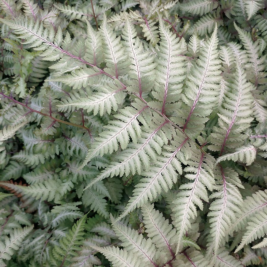 Athyrium niponicum var. pictum 'Metallicum' is commonly known as a Japanese Painted Lady Fern and is a truly ornamental, elegant deciduous fern that forms beautiful rosettes of arching, refined, bipinnate fronds. These lance shaped leaves shimmer beautifully with a silver gray almost metallic color, contrasted with subtle burgundy veination. The elegant arching mounds spread gradually. Ferns are absolutely perfect for the shade garden and this one will provide silver and green color for all your dark corners. The lacy fronds of ferns often soften the texture and look of other shade dwellers like hosta, astillbe, and tiarella. They thrive in naturalized settings so plant them in a woodland setting with loamy soil, near evergreens. To best care for ferns allow the foliage to remain over the winter to create a natural mulch. Clip off the dead and damaged leaves in the spring. Let this shade lover shine in all the darkest corners of your landscape.
