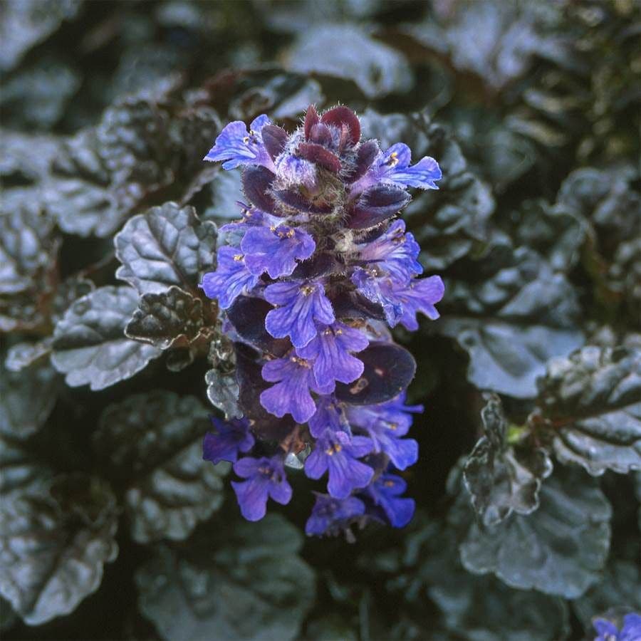 Simply the best ajuga for midnight-dark foliage, rich blue blooms, and great adaptability to varying soils and moisture levels, Black Scallop Bugleweed is a stunning groundcover for the garden floor or container. Its foliage is oversized, its habit very low and mat-forming, and its maintenance low.