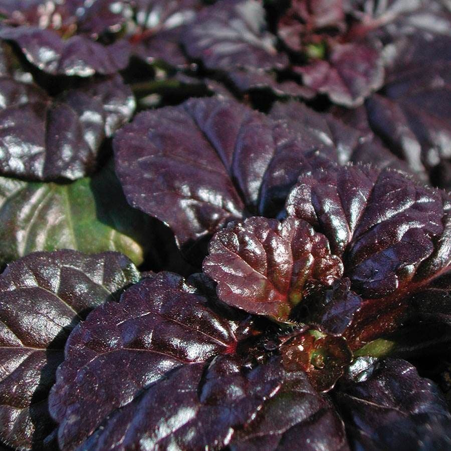 Black Scallop Bugleweed offers large, scallop-shaped leaves of such a deep purple that they gleam black even in the sun. They cover ground quickly, forming a weed-choking mat that replaces artificial mulches and adds dramatic color to the sunny to partly shaded garden. If planted about a foot apart, Black Scallop Bugleweed fill in in no time; however, they also spread up to about 3 feet wide, so may be spaced farther apart for more gradual coverage.