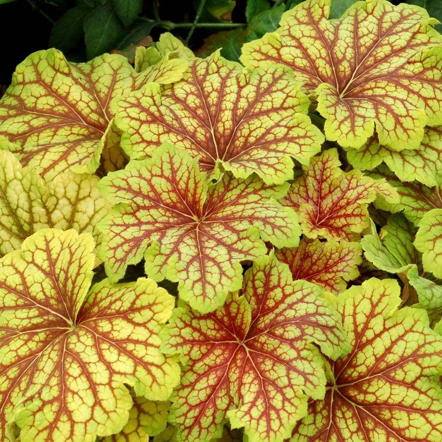 While all of our favorite heuchera set the bar high for foliage interest, this variety practically shouts with color! With its crimson veins that highlight the brilliance of its golden lime green leaves you'll find it hard to look away from this enthusiastic perennial. The visual appeal of its foliage is complimented by the darling white flowers which burst to life in summer, adding both vertical texture and the sight of feeding butterflies and hummingbirds. The bold leaves will bring color to your landscape all year long, even during the bare winter months. Plant it in a shady bed, border, or even a container to bring eye catching color to your garden. No southern shade garden is complete without these hardy heat and humidity tolerant heuchera. You will be struck by the year long foliage interest, pollinator attracting blooms, and easy maintenance of 'Red Lightning.'