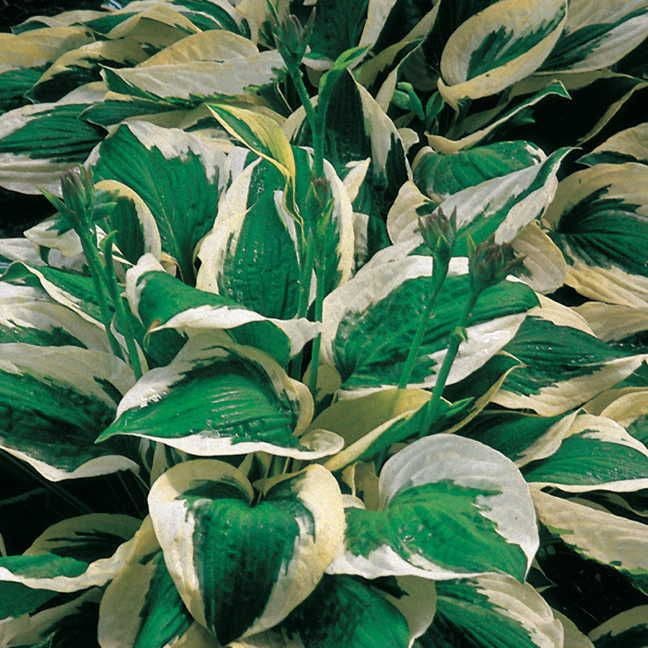The elegant Hosta Patriot is a treasure in any setting. Its graceful 5" x 7" heart-shaped leaves feature a rich, dramatic green background accented by lovely, flamboyant cream-colored borders. The result is a distinguished look that engages the eye and spirit. Sprouting out from the plant's center, they constantly provide fresh foliage in delightful layers that never lose their allure. Look for vibrant purple shoots in the springtime and charming, pale, lilac-hued blooms in the summer.