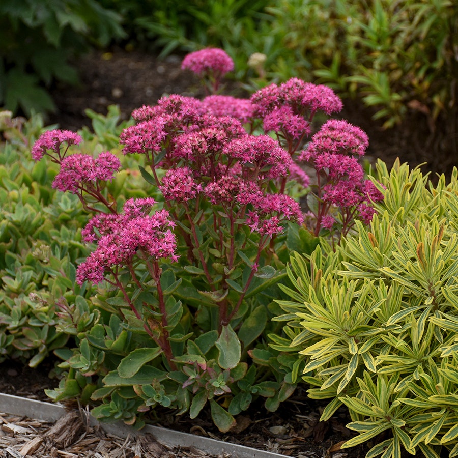 Sedum is a wonderful low maintenance perennial to add to a landscape that experiences warm and hot summer months. The large grey green leaves provide a nice display from spring through fall. In mid summer, magenta blooms appear to enhance the display. Butterflies and bees will love to stop by the flowers for a visit.