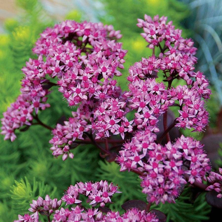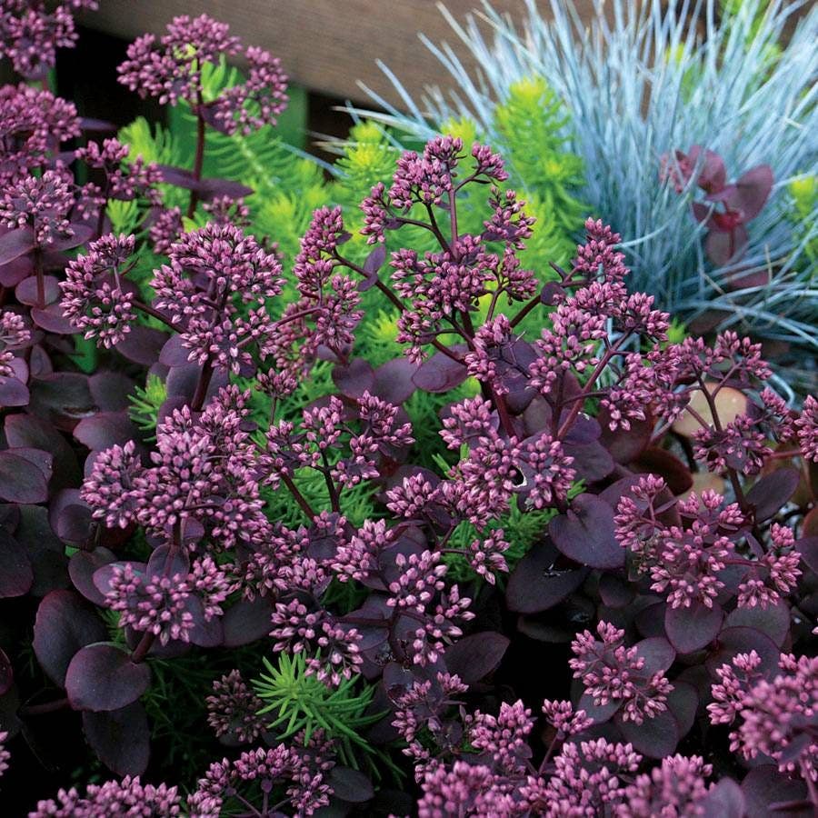 For nonstop color from spring until frost in any sunny spot, rely on the SunSparkler® series of Stonecrops! These heat- and drought-tolerant groundcovers spread quickly and look terrific with colored foliage and bright late-season blooms. Cherry Tart is one of our favorites, sporting small, rounded red leaves season after season, topped by huge clusters of dark rosy-pink blooms from late summer into fall!