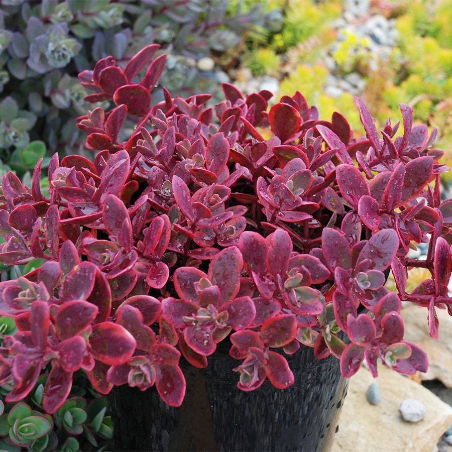 Showcasing vivid cherry red succulent foliage and glowing clusters pink summer flowers, Sedum SunSparkler® 'Wildfire' truly lives up to its name. Some plants are only interesting when they're in full bloom, but stonecrop stay appealing for most of the year. Sedum SunSparkler® 'Wildfire' blooms through fall, breathing new life into a relatively quiet season for the garden. This perennial is compact and a breeze to grow, needing next to no maintenance to rise and thrive in your garden. Sedum SunSparkler® 'Wildfire' is a durable plant that is native to mountainous areas making it quite comfortable in rocky terrain. If you've got a rough, uneven patch of land you'd like to spruce up with some color look no further than 'Wildfire' sedum. While it looks phenomenal in the ground it is also a feisty beauty in containers as well. Like most of its kind this succulent plant doesn't need a lot of moisture and performs best in well-drained soil.