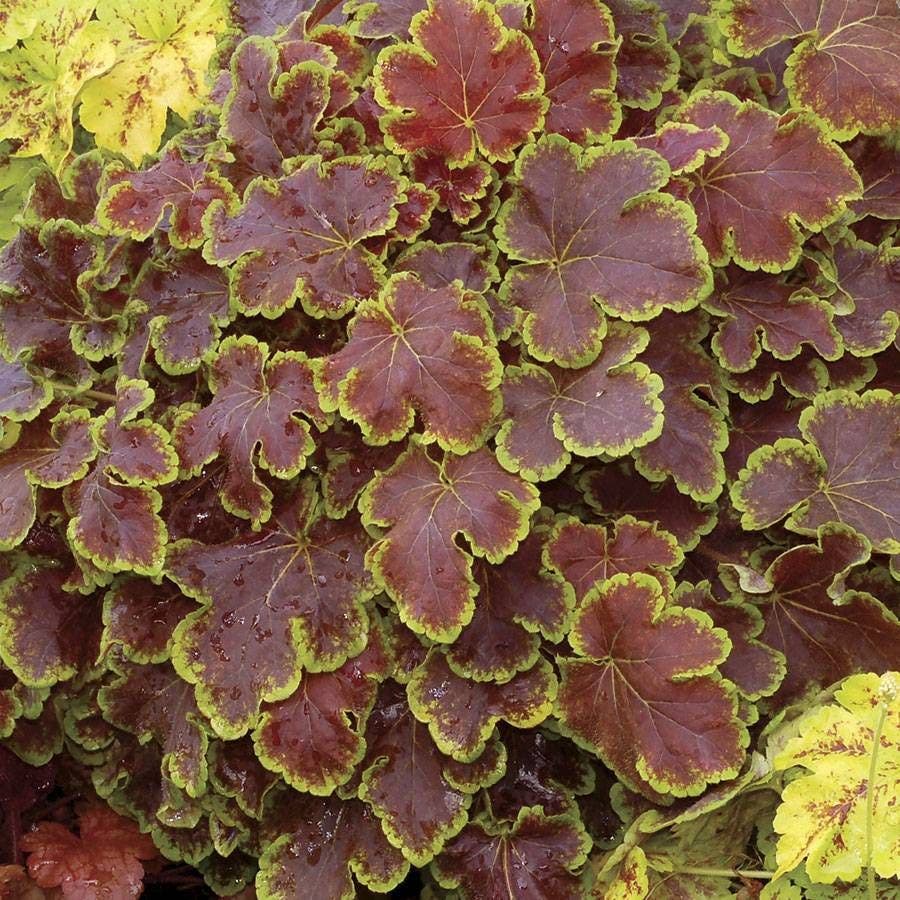 Colorful Heucherella have a special place in our hearts, but 'Solar Eclipse' really steals the show. This aptly named plant flaunts scalloped leaves which feature a mahogany red center traced with a line of bright lime color along the edge. 'Solar Eclipse' is so versatile and convenient as it presents a reliable color, making it especially essential in winter gardens when horticulturists have to get creative tackling the coldest season of the year. It also offers floral interest in the form of small white summer flowers. This stunning perennial grows vigorously yet keeps to a nice tidy compact habit.