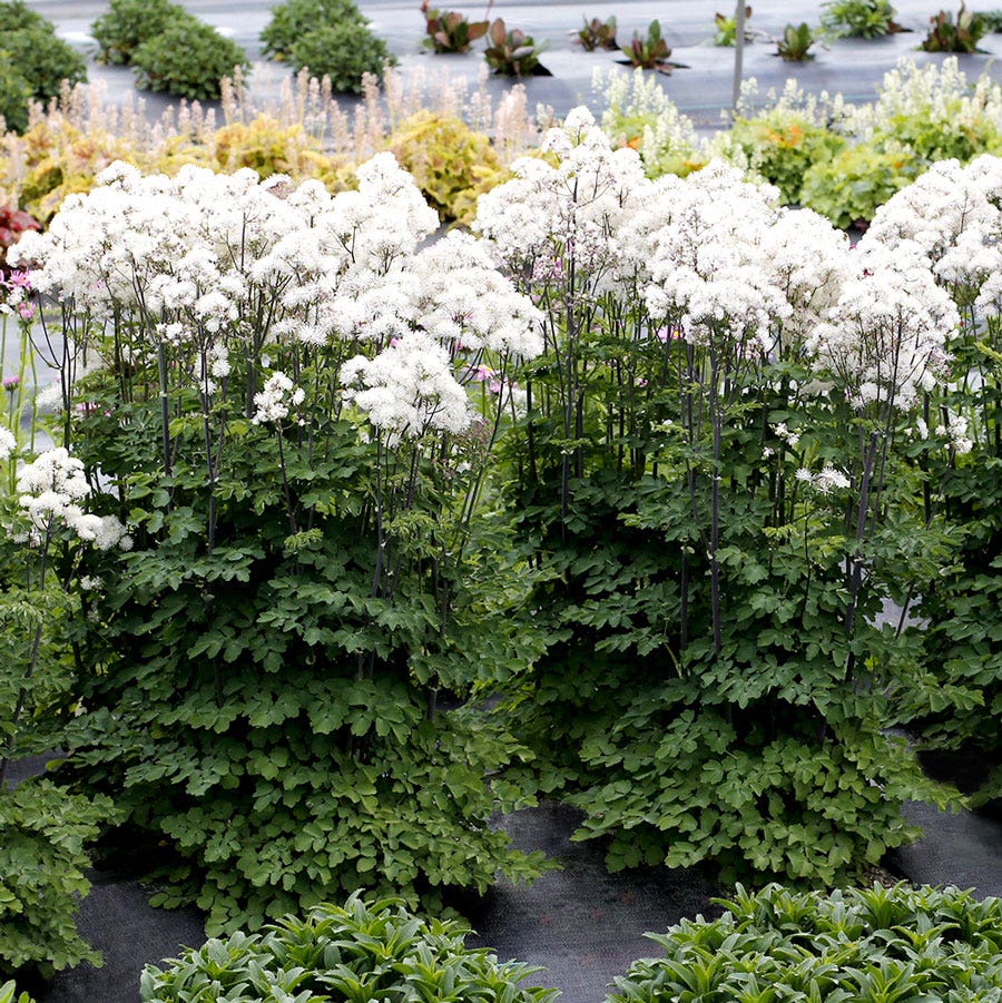 Our native Meadow Rue has never been so magnificent! Nimbus™ White is a stunning selection with abundant snowy blooms from late spring into summer, showy lavender-pink seedpods, and dark stems. It stands tall and proud in the sunny to lightly shaded perennial garden!