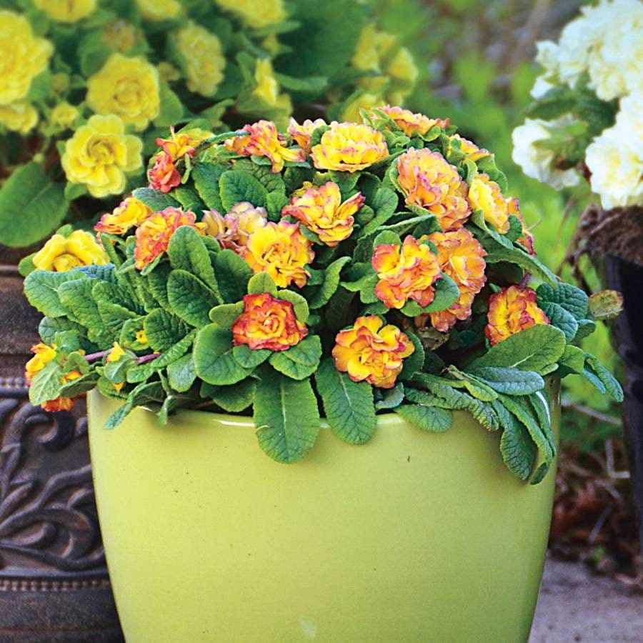 Take the elegant English garden form and combine it with a tropical island color palette and the result is the'Nectarine' primrose. All through the spring season this prolific cultivar produces thrilling fully double blooms which range in colors from golden mango to spicy rose. Despite their petite size, the flowers are simply dazzling and create quite the spectacle bursting from containers and windowboxes. All of floral magic comes wrapped in flattering evergreen foliage that is resistant to common pests like deer and rabbits. 'Nectarine' is easy to grow, but for best results remember to give it plenty of consistent moisture and dappled shade.