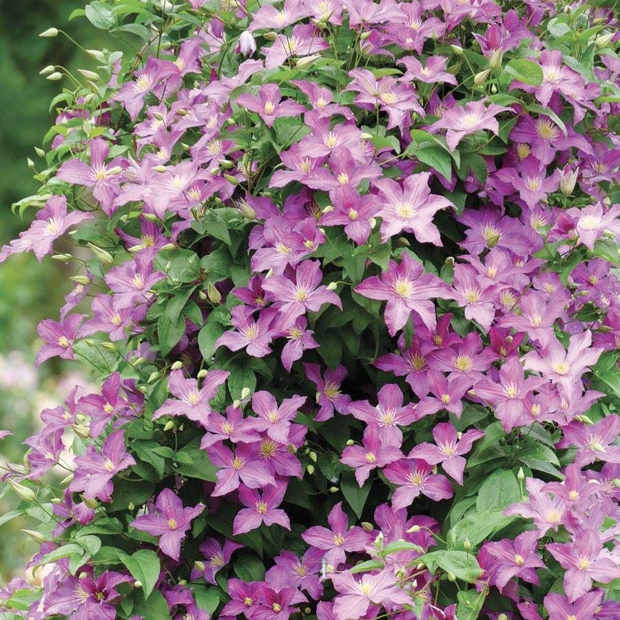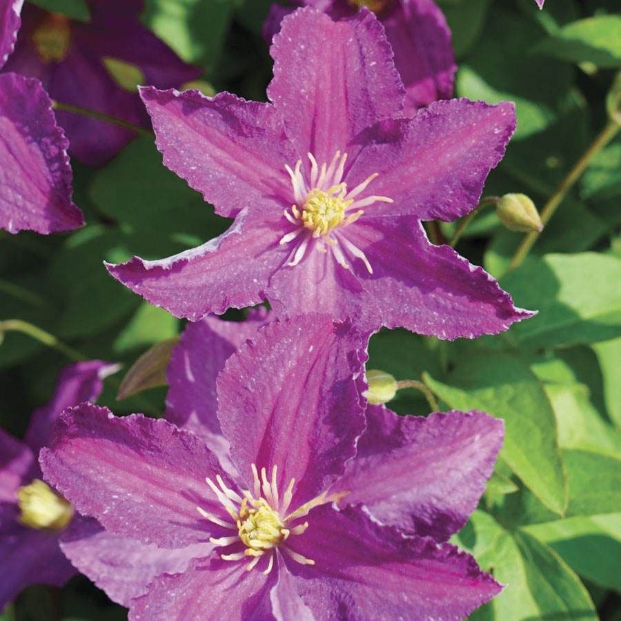 Clematis Jolly Good™ is a showy, perennial, late-flowering clematis offering summer interest, blooming heavily in midsummer and repeat blooming to early fall. Free flowering, the plant sets abundant light purple flowers with magenta undertones and creamy white stamens. Plants bloom on new wood and attract butterflies and hummingbirds.
