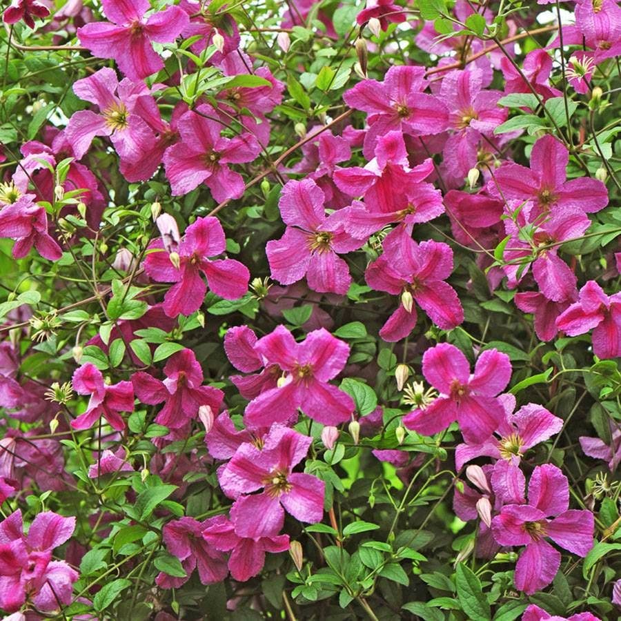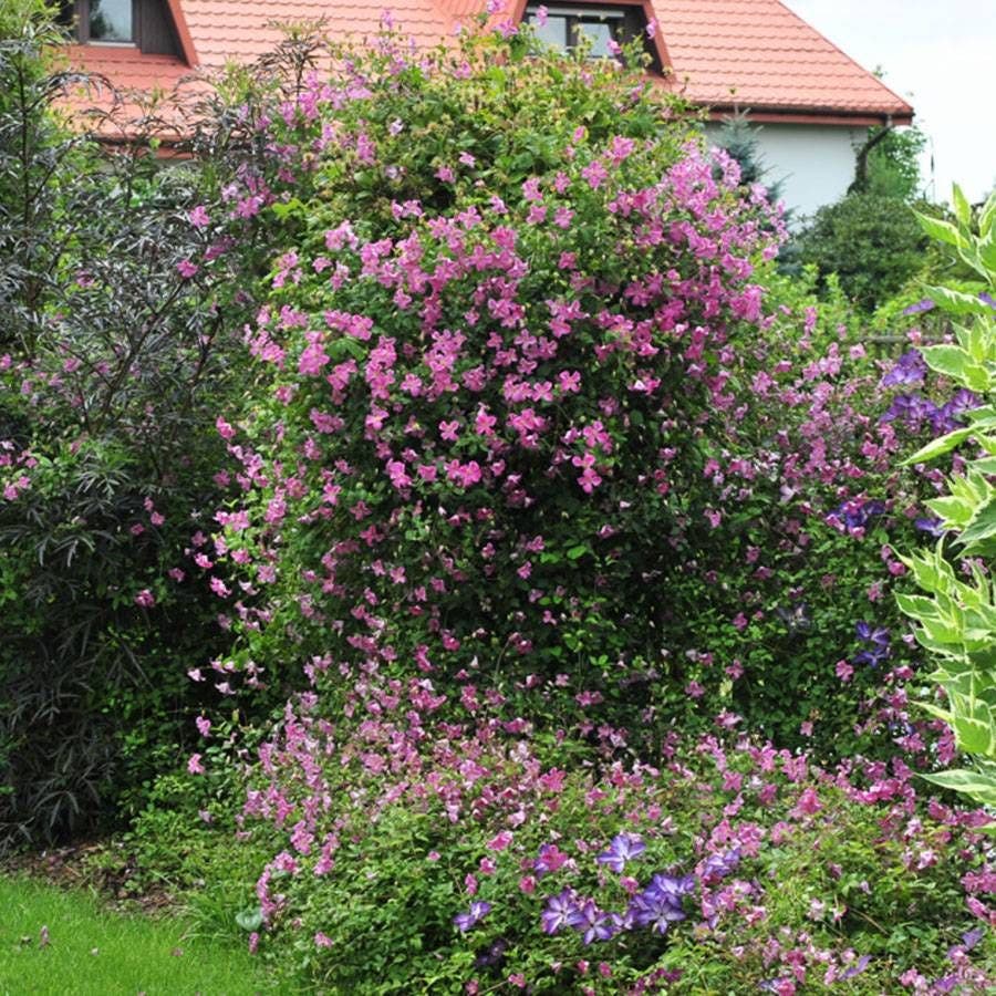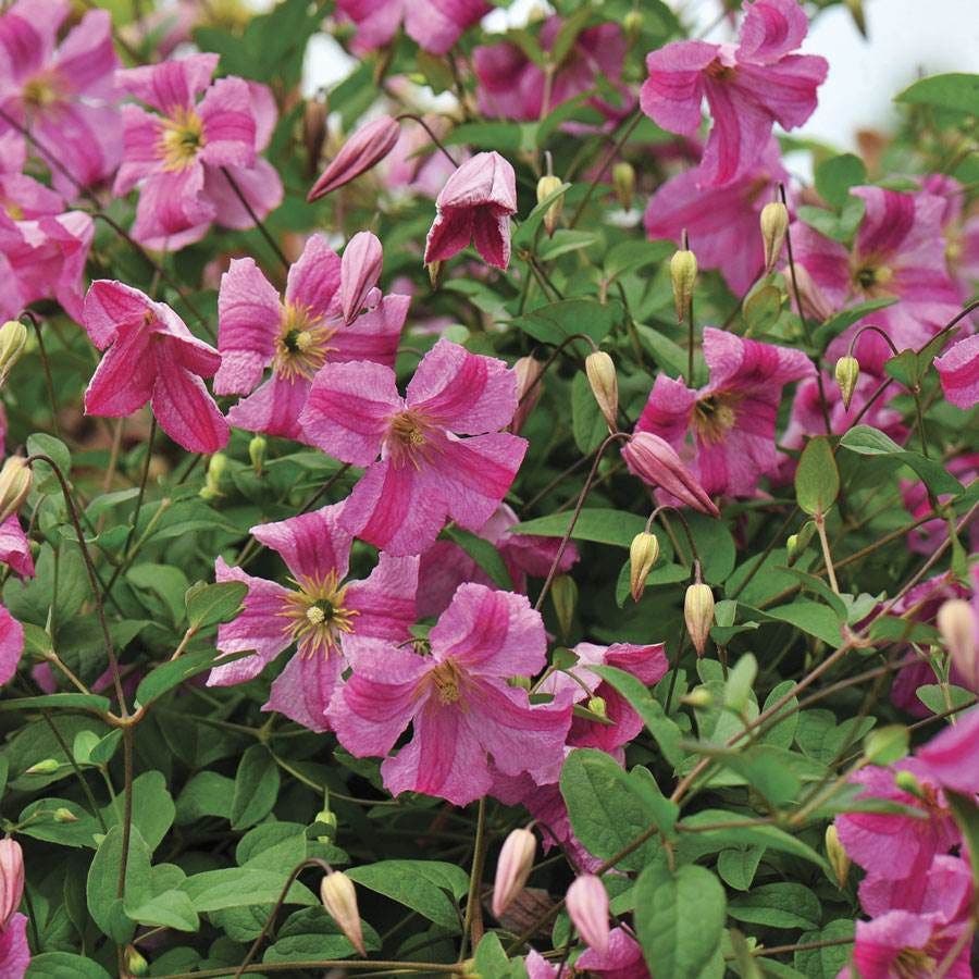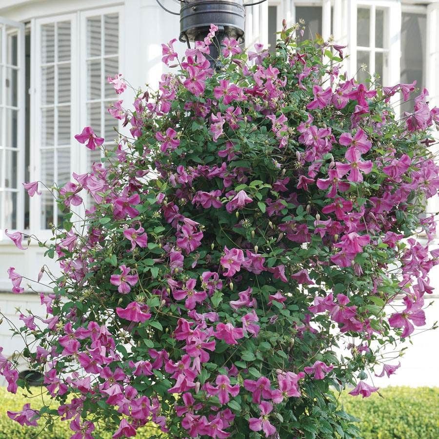 Clematis Pink Mink®, a deciduous climbing vine, has an upright, vining habit of relatively small, bright green leaves that stay fresh and attractive all season. There is an old saying about clematis' growth rate: The first year they sleep, the second year they creep, and the third year they leap. Train clematis to climb a trellis, arbor, post, or fence, adding vertical interest. Or allow it to amble along the ground, meandering gracefully through the shrubbery. But for something really special, pair it with a climbing rose, allowing the nimble clematis to twine its way around the sturdy rose stalks. The two will elegantly mingle blooms in the early season, but the clematis will carry it through the heat of summer and the rose will pick up again in fall as the clematis' blooms fade.