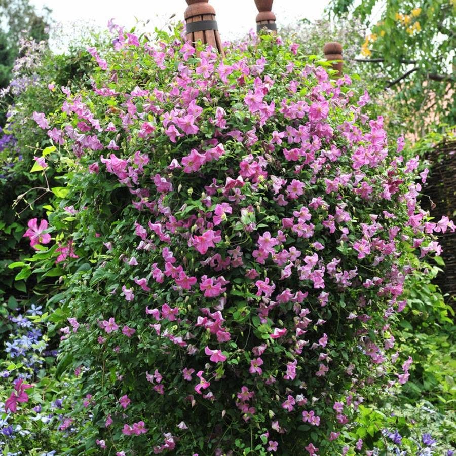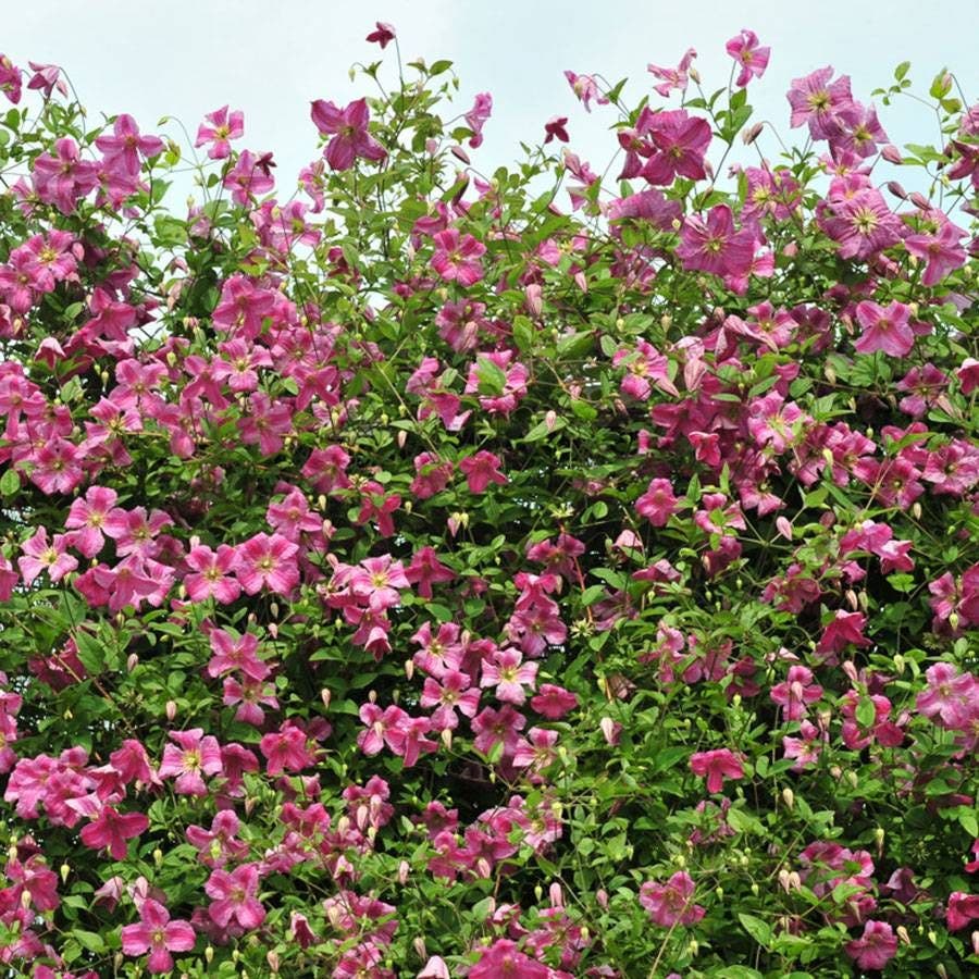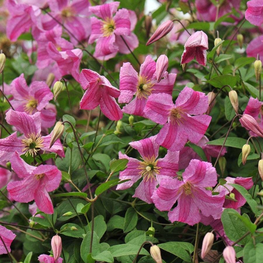 Clematis Pink Mink® is a showy, perennial, late-flowering clematis offering summer interest, blooming heavily in early summer and repeat blooming to early fall. Free flowering, the plant creates a veritable curtain of single, pink flowers with a broad central stripe on each petal. Plants bloom on new wood and attract butterflies and hummingbirds.