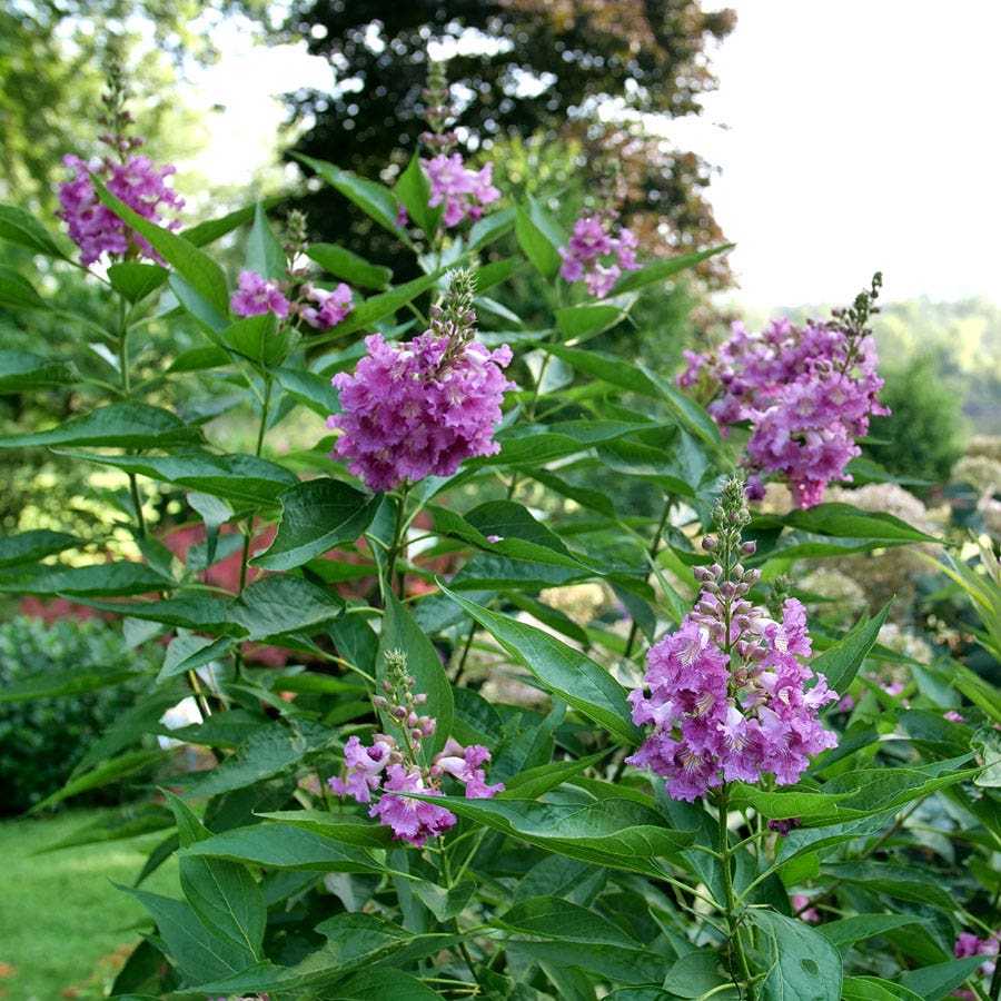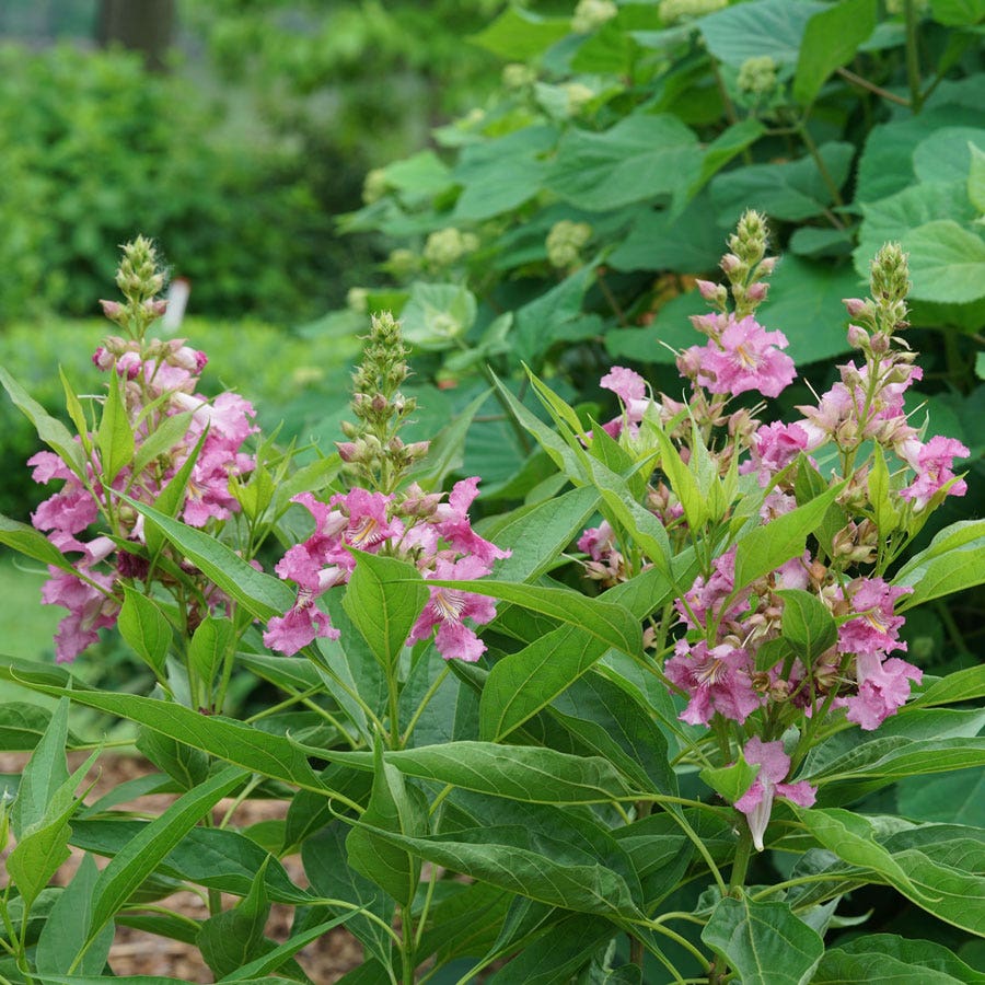 A Proven Winners® ColorChoice® Flowering Shrubs variety, Chitalpa El Niño™ Desert Orchid is a deciduous shrub or miniature tree that blooms in late spring/early summer, continuing sporadically throughout the summer. The fragrant, dark purple, pollinator-friendly flowers look very much like orchids and attract bees to the garden.