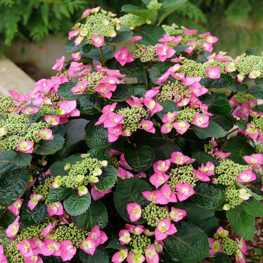 A Proven Winners® ColorChoice® Flowering Shrubs variety, Tuff Stuff Top Fun™, a lacecap mountain hydrangea, is a woody deciduous shrub offering year-round interest. Heavy blooming, it blooms and reblooms continually on old wood from summer through fall. Highly colorful, the lacecap clusters of hot pink or vibrant purple florets "pop" against flushes of dark blue-green foliage, which takes on shades of burgundy in late summer. Although the vibrant flowers make long-lasting cuts for fresh and dried arrangements, left in the garden, they're a valuable wildlife food source, attracting bees, butterflies, and beneficial insects in summer, and their seeds attracting songbirds in late fall.