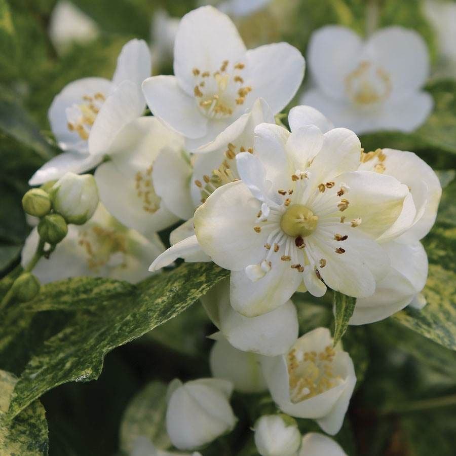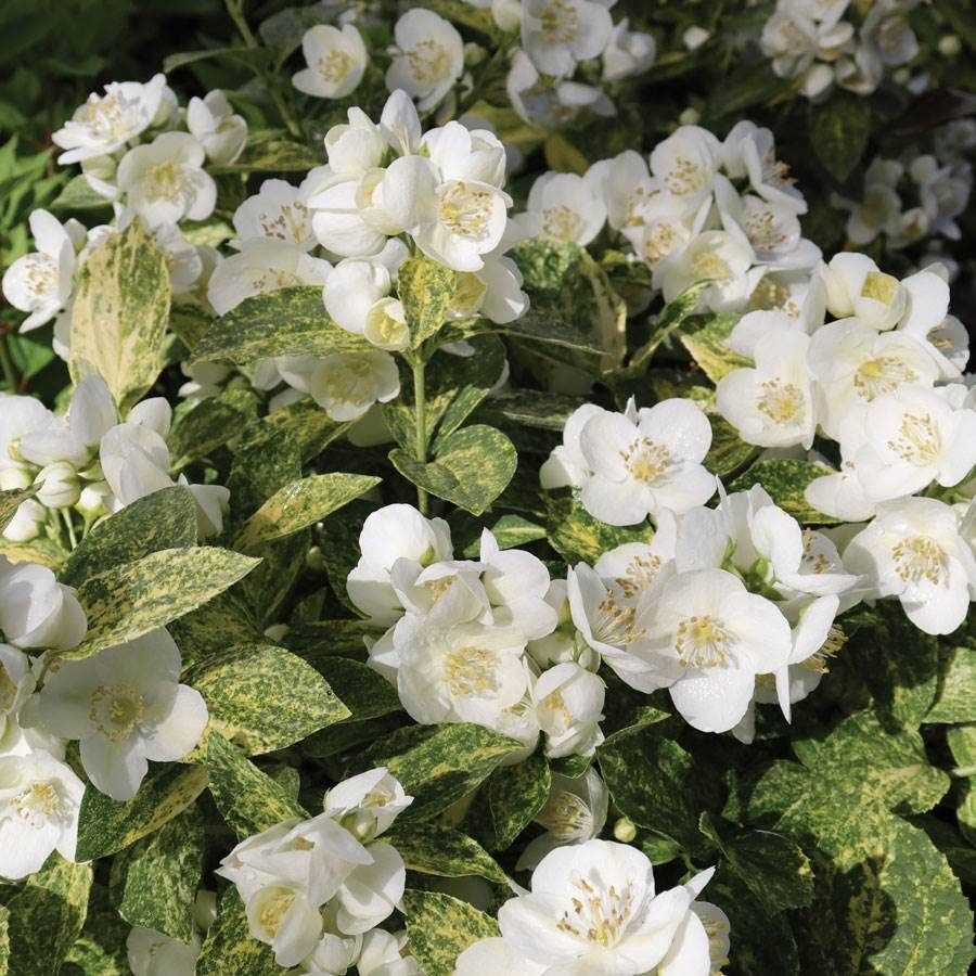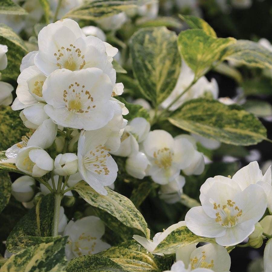 A Proven Winners® variety, Illuminati Sparks™ is a flowering deciduous shrub offering 3 seasons of interest, blooming in late spring or early summer. Borne on graceful branches dense with variegated green and yellow foliage, abundant clusters of highly fragrant white flowers perfume the garden with a citrusy orange-blossom scent, attracting bees and butterflies. The lustrous leaves add color and texture to the garden all season and are often used as foliage filler in floral arrangements.