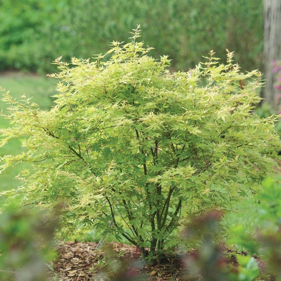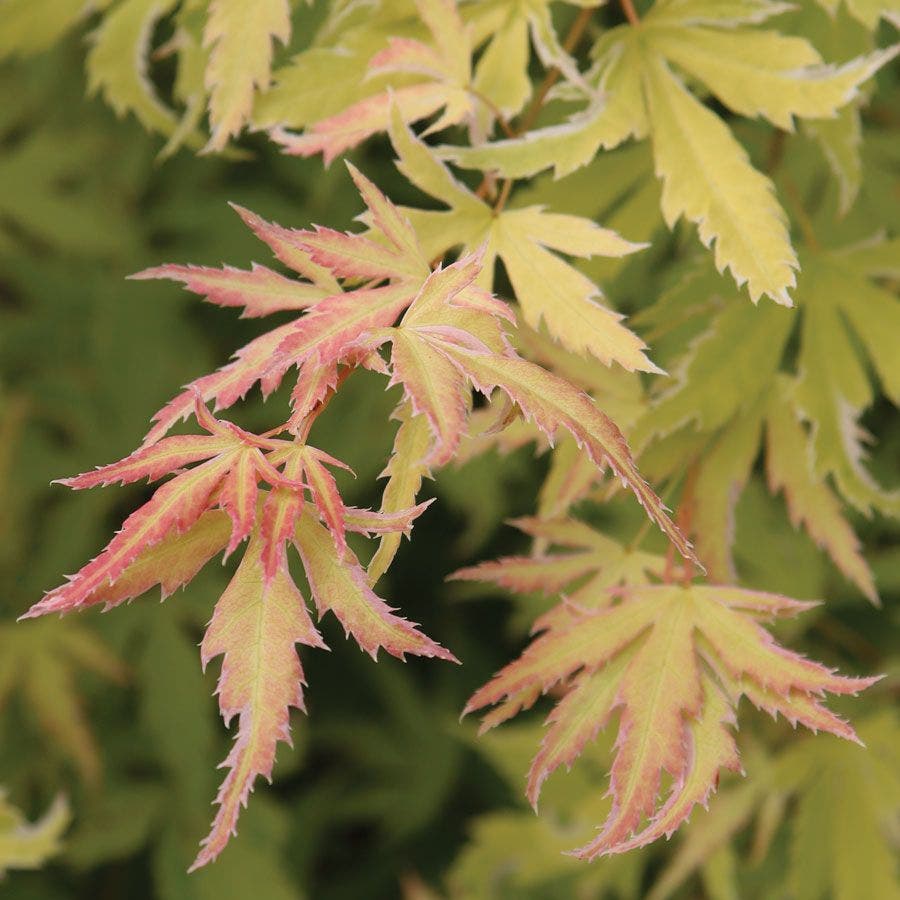 A Proven Winners® ColorChoice® Flowering Shrub, Acer Metamorphosa™ is a dwarf Japanese maple. This deciduous shrub or multistemmed small tree offers year-round interest, with its lovely architecture, lacy leaves, and ever-changing color. In early spring, Acer Metamorphosa blooms in attractive, but insignificant, reddish-purple flowers as it begins to leaf out in intricate yellow-green leaves. As the young leaves expand, they develop pinky red margins that, in summer, fade to white with hints of reddish orange. In early fall, as the leaves begin to turn bright orange red, before deepening to red violet, winged samaras replace the flowers. The flowers sustain pollinators, and the samaras support songbirds.
