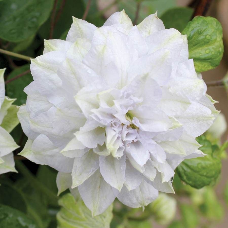 Each pom-pom bloom is so full and lush that it becomes nearly spherical, with white petals reflexing to point downward, all streaked with lime midribs. The petals are almost iridescent, and they are tinged with lavender reverses for a soft, ethereal appearance. The compact vine grows only 5 to 6 feet tall, but fills out nicely with big, plush leaves and blooms. What a regal presence.