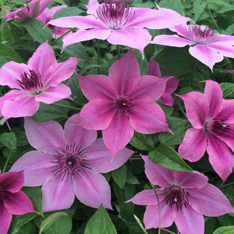 Plant Rosalie Clematis in the sunshine, and it will bloom from spring through the summer. The blooms range in color from light lavender, to pink, and even dark magenta and maroon. All contrasted against its green foliage. Rosalie Clematis will cheerfully transition your garden from spring to summer with its showstopping vertical blooms.