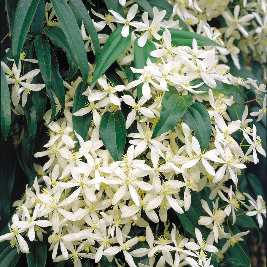 Famed plant collector E. H. Wilson discovered the Snowdrift Clematis in China. This Asian variety grows quickly and boasts a bold, dark green foliage that is admirable even when the blossoms aren't in season. Beginning in mid-spring, tiny white flowers erupt all over the Clematis, which are very fragrant. Wilson was said to be entranced by the flowers' beauty and fragrance. Measuring up to two inches wide, these blossoms offer a stark contrast to the dark foliage. The Snowdrift makes an impressive statement, yet it is very easy to maintain.