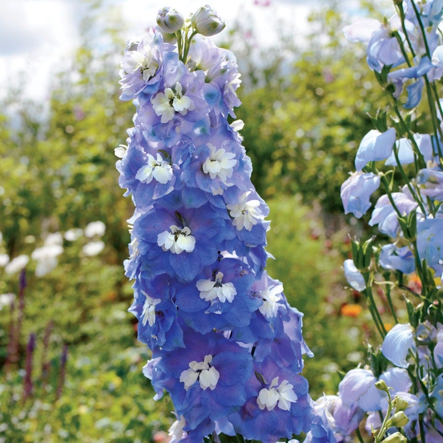 Aurora™ Blue Delphinium emerges as the epitome of blue delphinium excellence, combining unparalleled growth vigor with a remarkable uniformity that sets it apart from other cultivars. Its robust structure supports magnificent spires adorned with vivid blue semi-double florets, each highlighted by a striking pure white center, or "bee." Flourishing from early to midsummer, these delphinium blue flowers transform the garden into a vibrant haven for a myriad of pollinators, including bees, butterflies, and hummingbirds, thus playing a crucial role in the ecosystem.