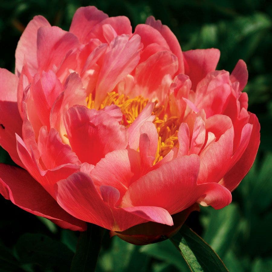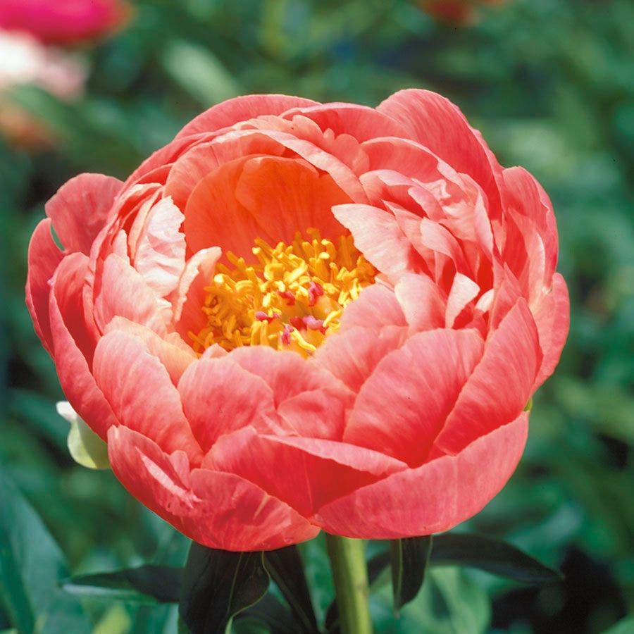 'Coral Charm' Peony A color breakthrough for peonies. When this 'Coral Charm' Peony was introduced, it won the 1986 Gold Medal of the American Peony Society, and has been winning hearts ever since. The deep coral budsbeautiful in themselvesopen to bowl-shaped blooms with gracefully incurved petals of coral-peach surrounding a frilly, glowing mass of stamens. 5 to 6 inches across and very long-lasting fresh or cut, these mid-spring blooms are the focal point of any garden setting.One of the few peonies to flourish in the southern end of its hardiness range, 'Coral Charm' Peony is an exceptionally robust garden plant, reaching 36 inches tall and covered with blooms. Its lovely foliage forms a nice backdrop for daffodils and a foreground for mid-to late-summer lilies.
