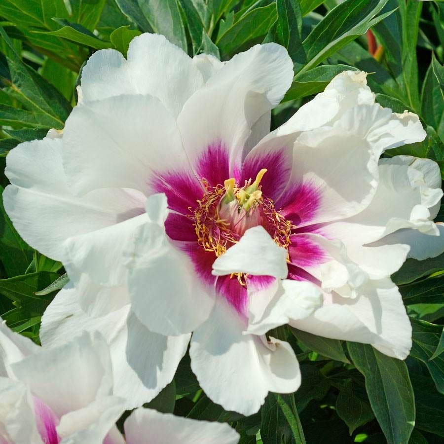 'Cora Louise' is an Itoh peony offering late spring to early summer interest. A prolific bloomer, producing up to 50 blossoms per mature bush, the plant sets large pure white semidouble flowers8 to 10 inches widerevealing a flushed lavender to purple eye and golden stamens. Borne on strong, erect stems that don't require staking, the sweet-scented, long-lasting flowers attract butterflies and hummingbirds and make excellent cuts for romantic floral bouquets. Peonies are an investment that can live for up to 100 years.